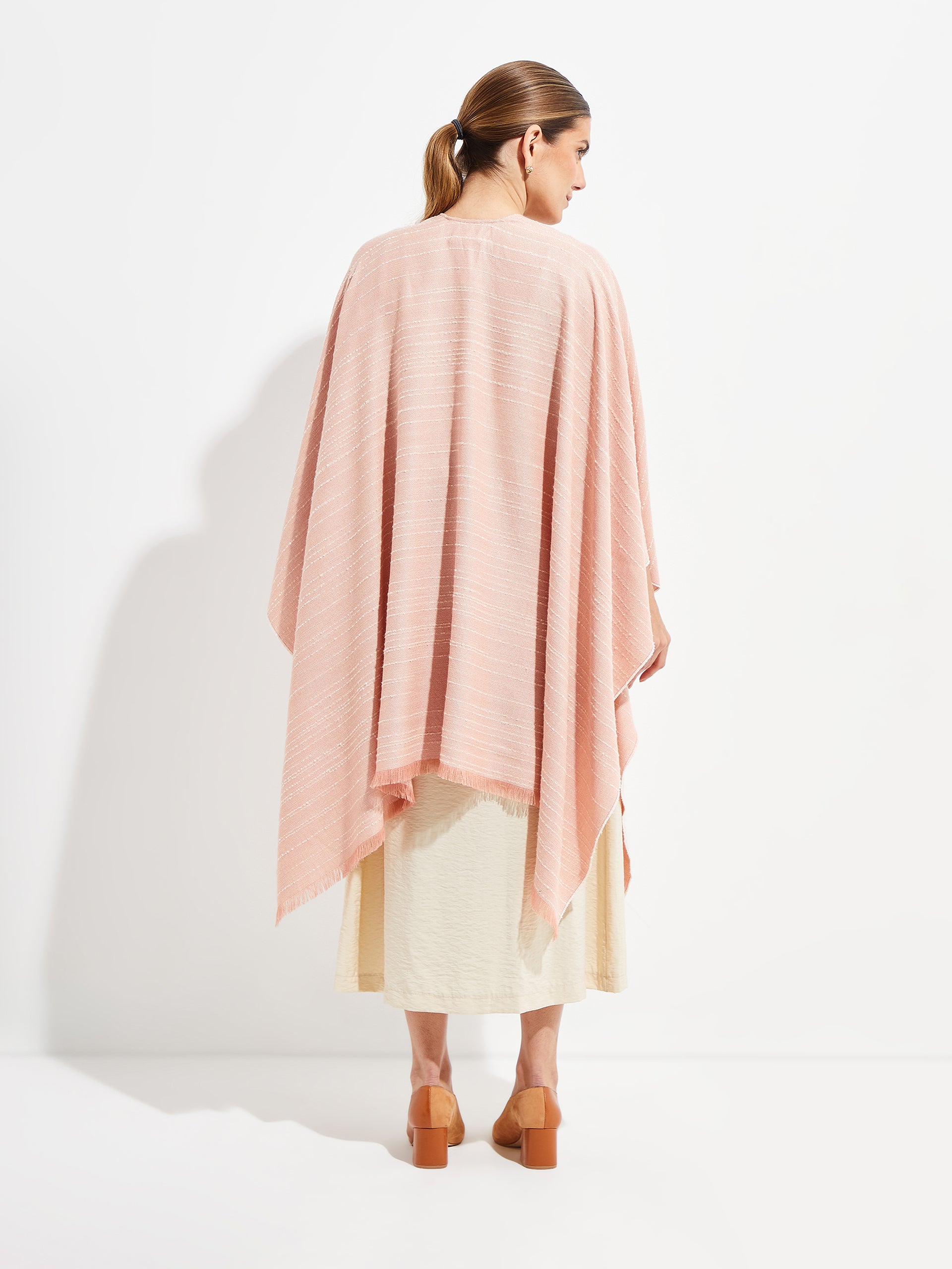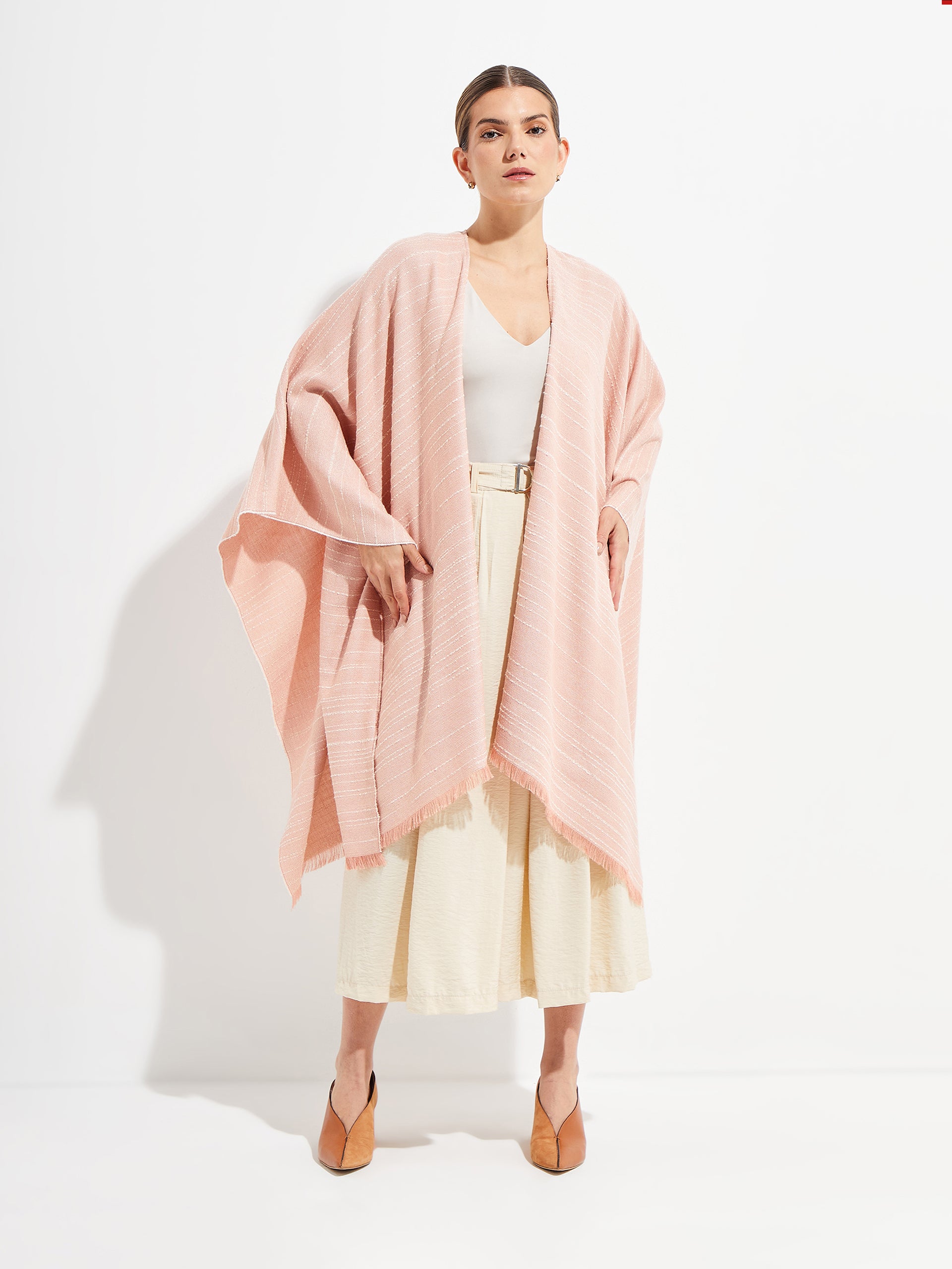 Ygriega is an exclusive cape made of baby alpaca, silk, bamboo and cotton. Its discreet striped design combines elegance and softness, offering a perfect balance between warmth and lightness. The blend of materials provides comfort and freshness, making it ideal for special occasions or day to day with a sophisticated touch. | Predominant material: Cotton
