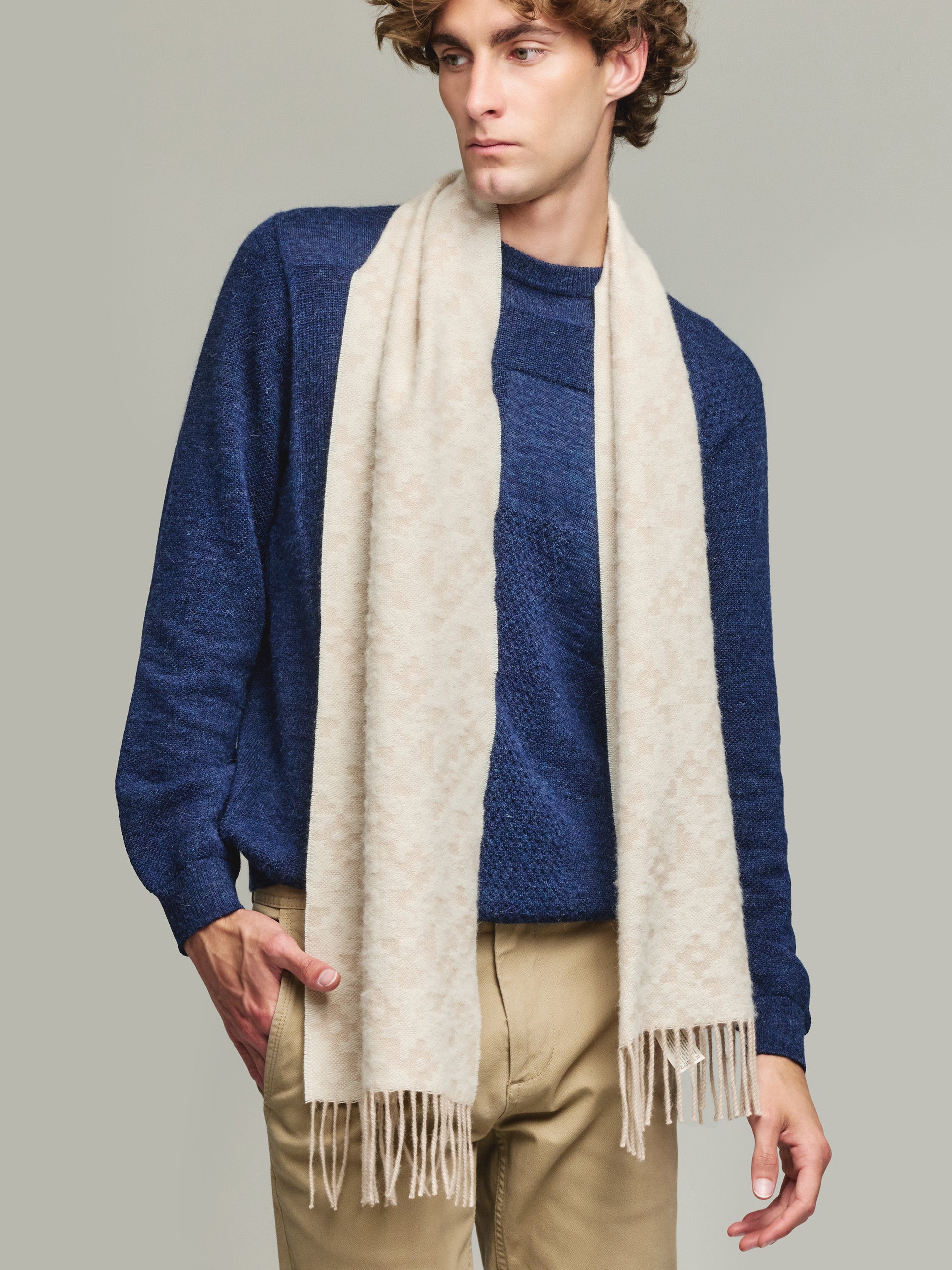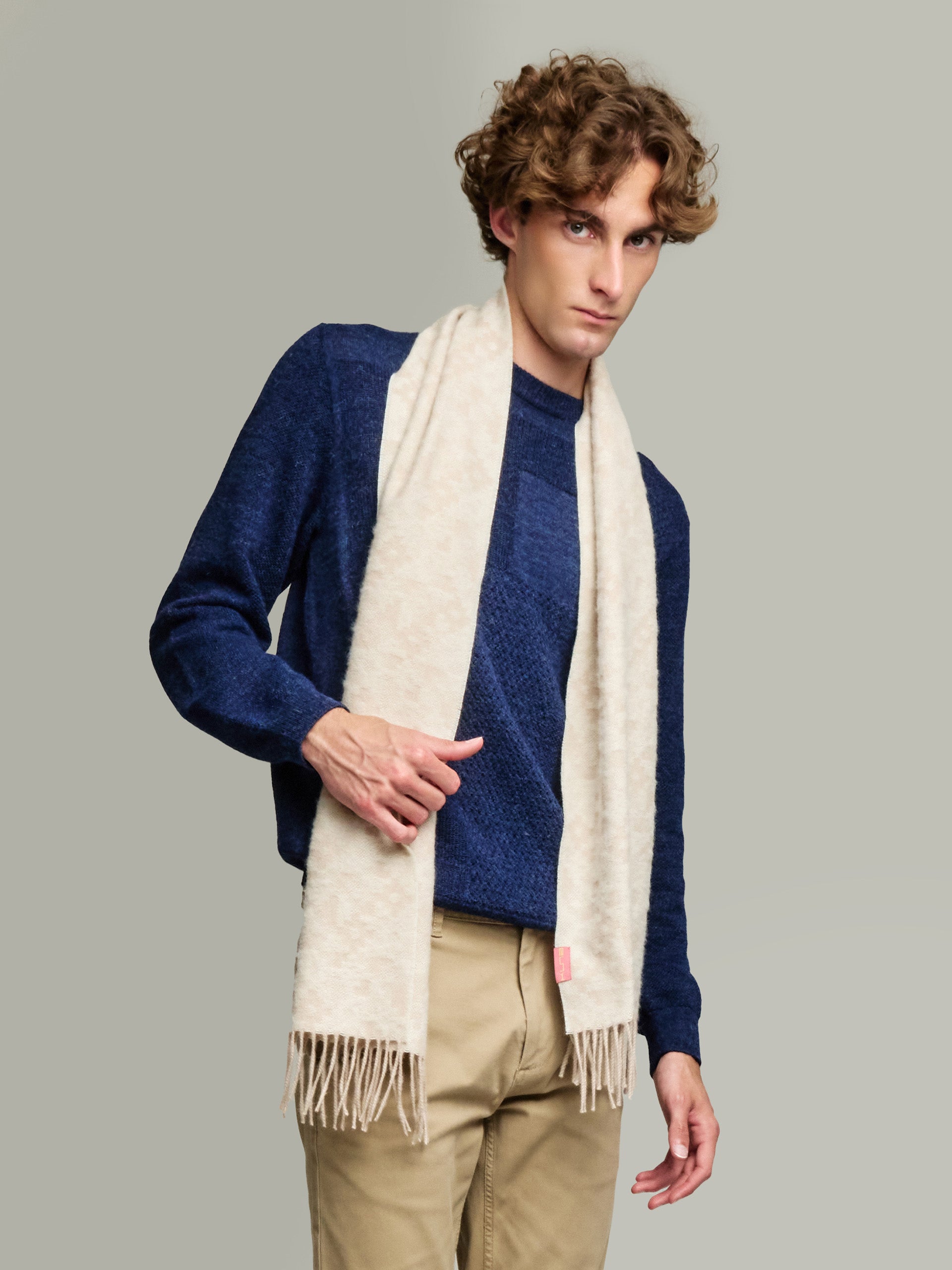 The Yldis scarf stands out for its boldness, urban style and original patterns. Perfect for adding a touch of personality to any outfit. Made of 100% baby alpaca and available in three warm colors, it is the ideal choice for those looking to stand out with elegance and sophistication. | Material predominante: Baby Alpaca