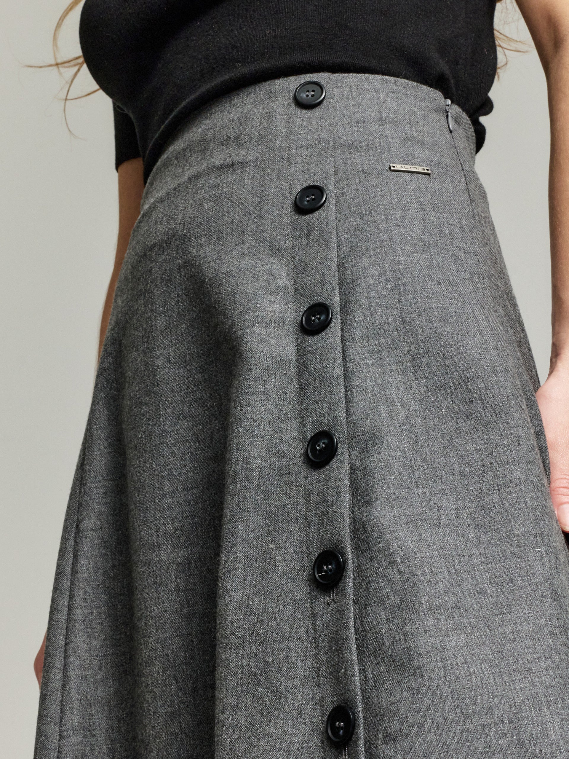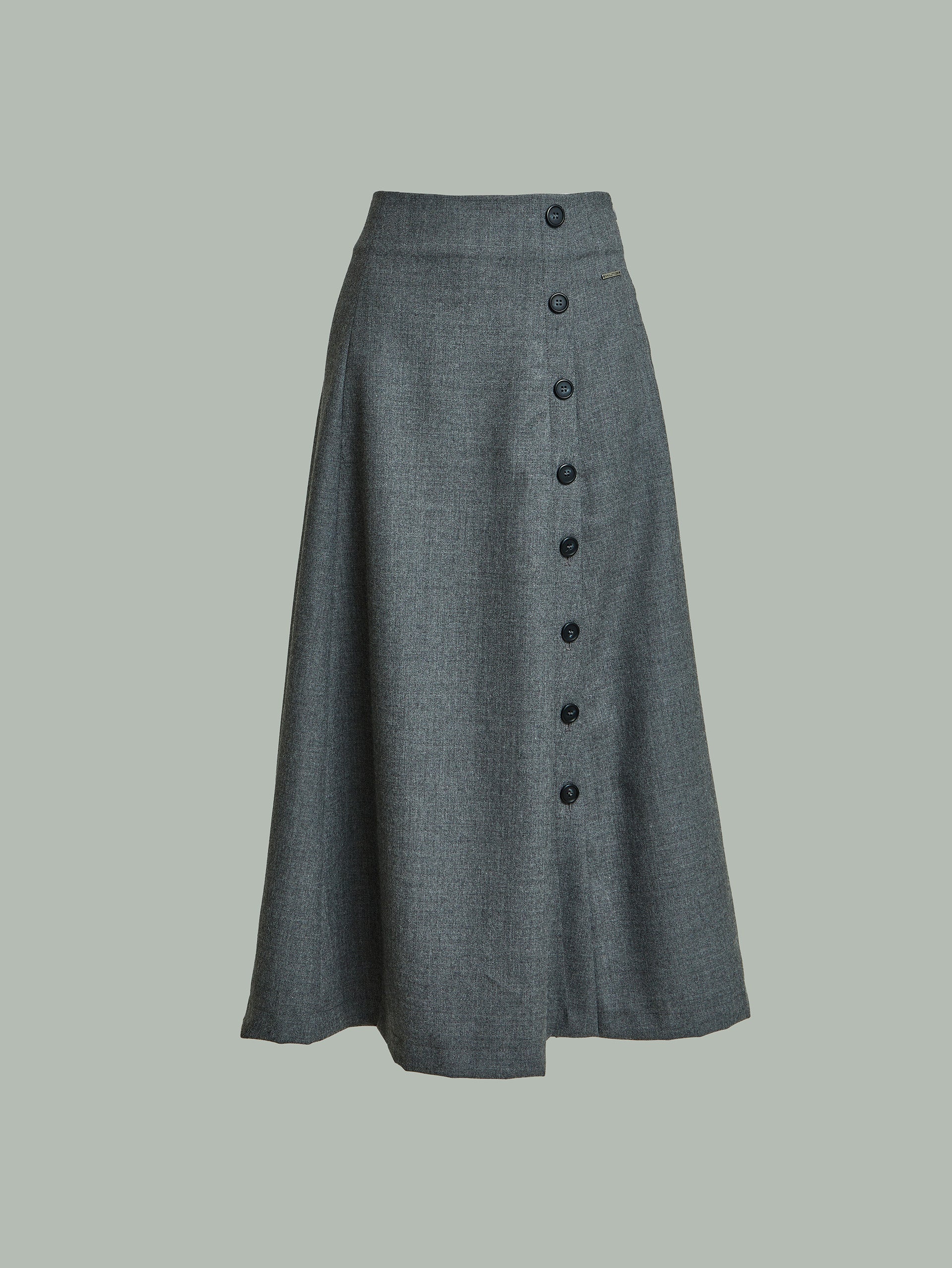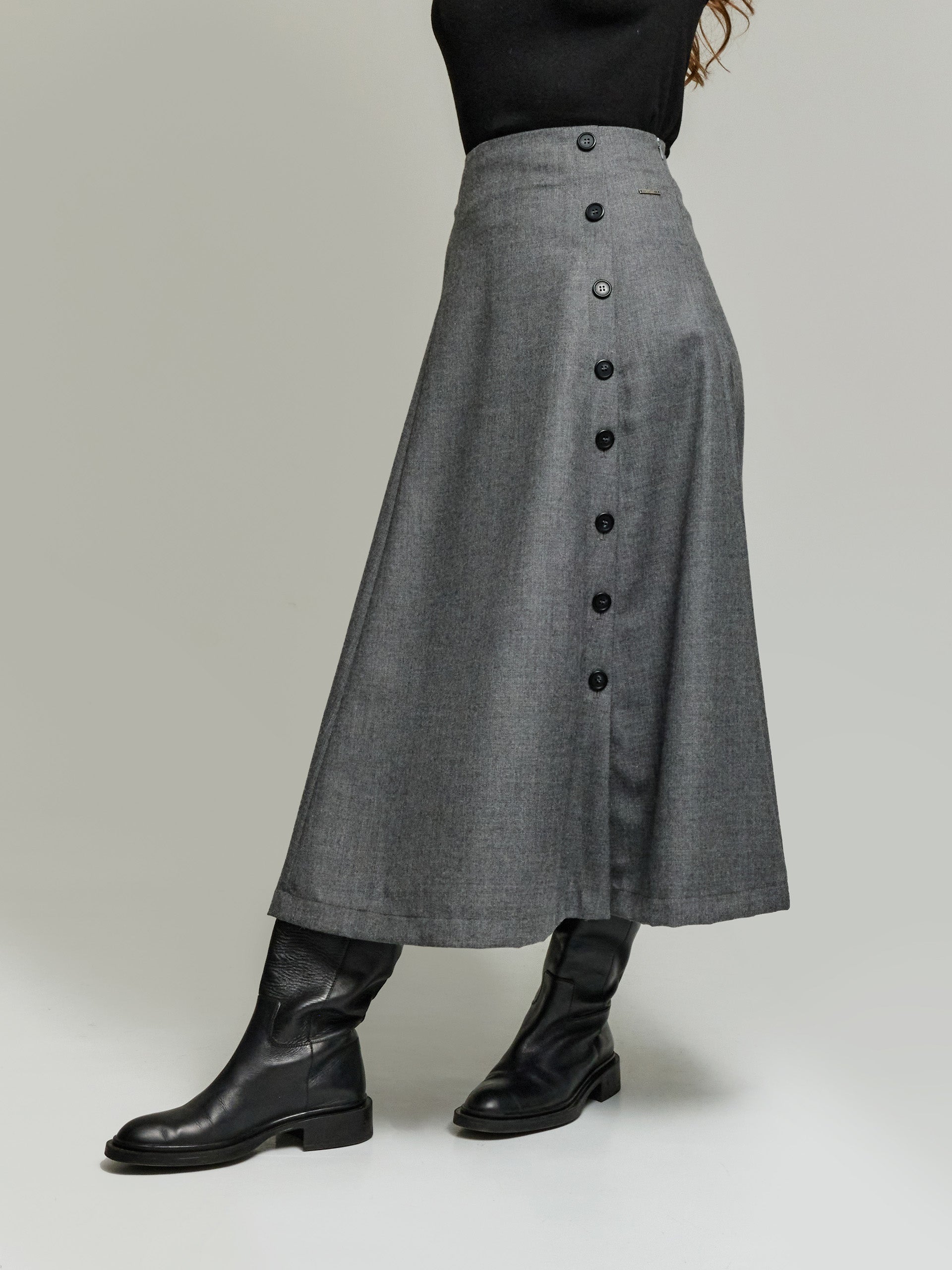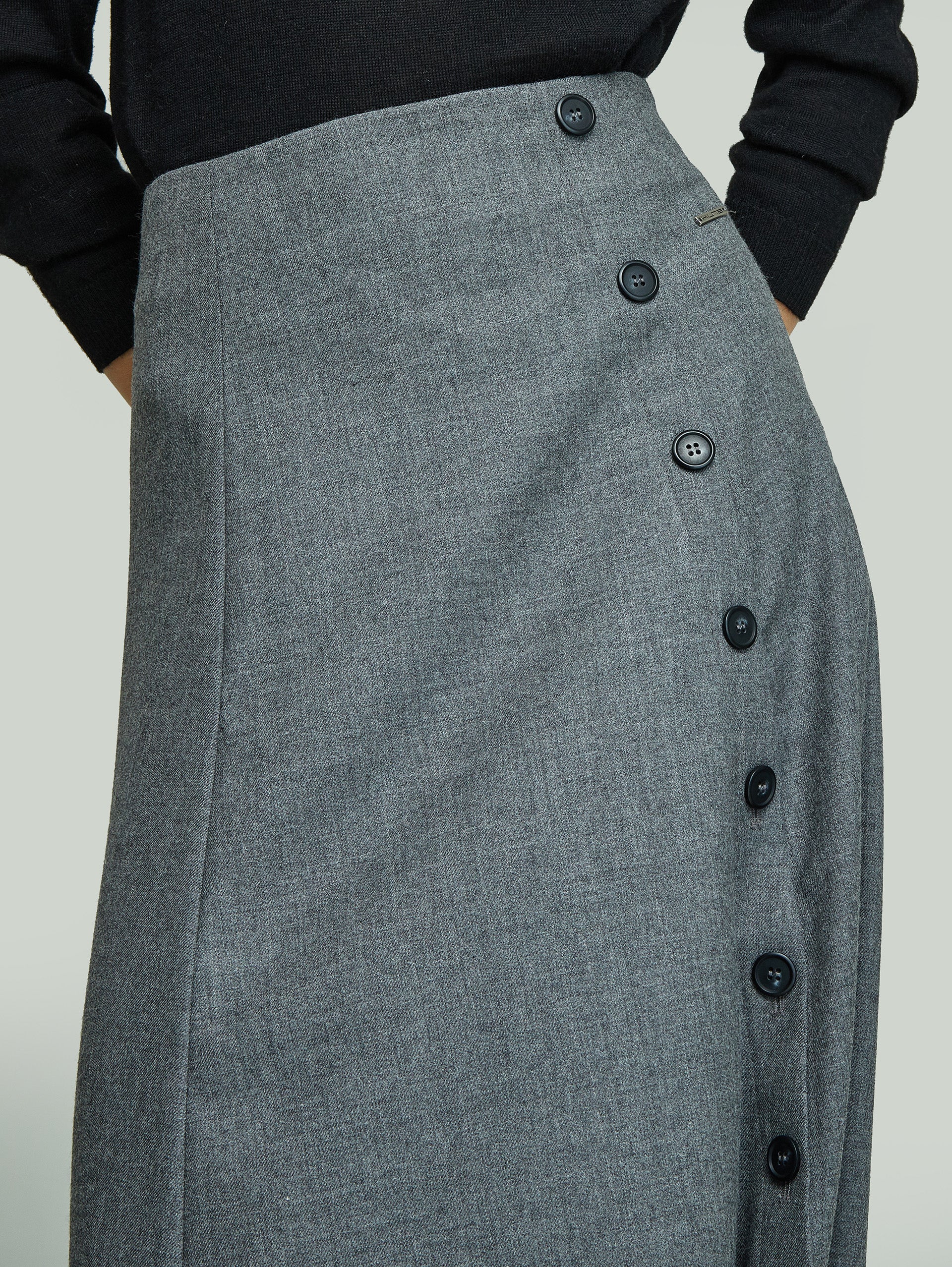 Immerse yourself in the discrete elegance of Ysidro, the must-have skirt for the season. Its carefully crafted design includes buttons on the left side, adding a distinctive touch. Fitted at the waist, the skirt opens subtly creating a charming bell effect, gracefully enhancing the silhouette. Made of wool and baby alpaca. | Material predominante: Wool