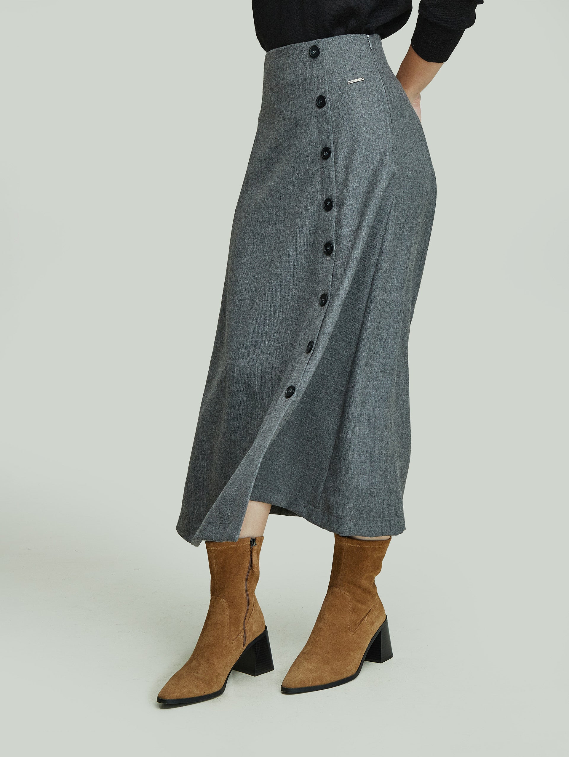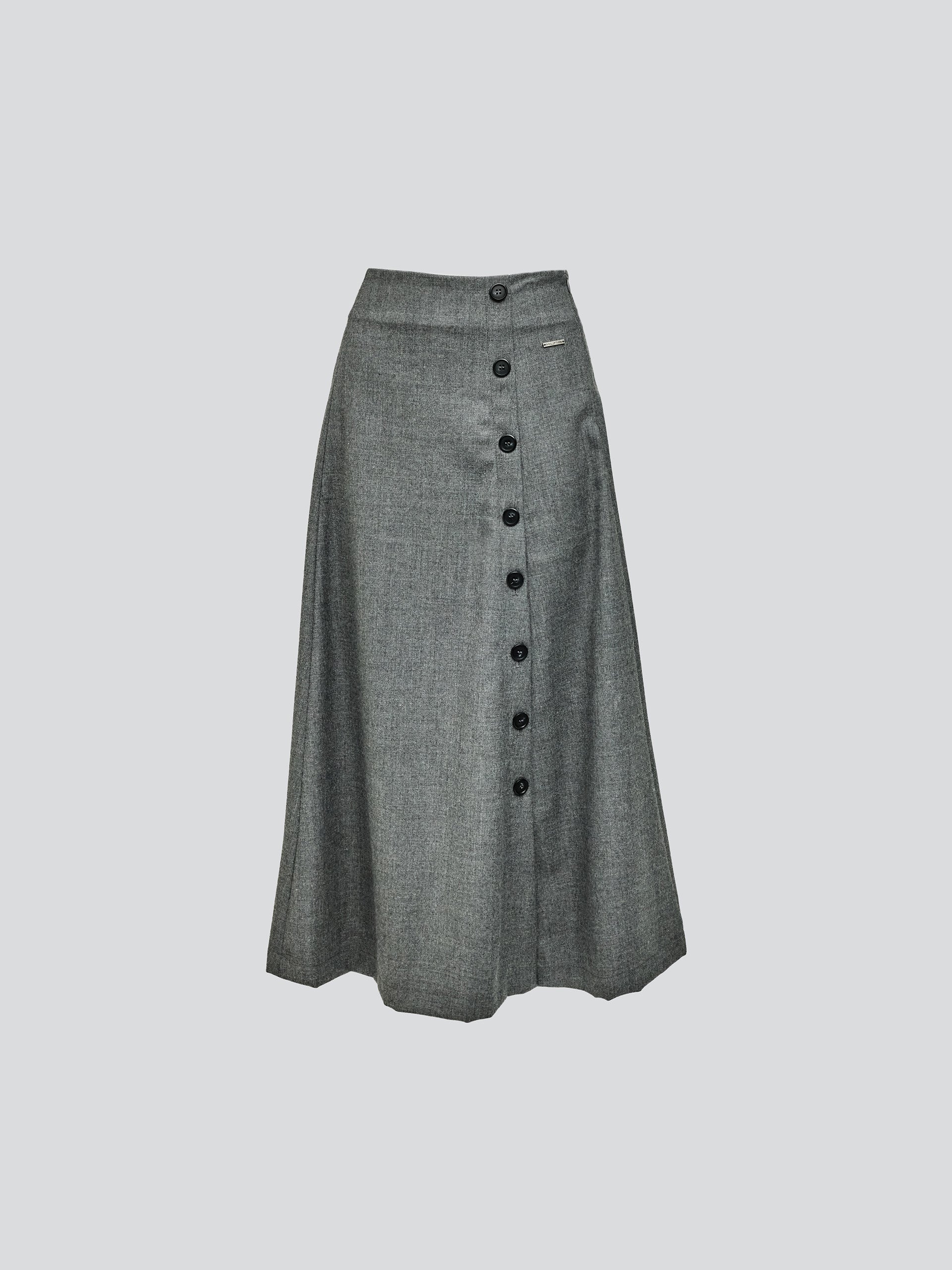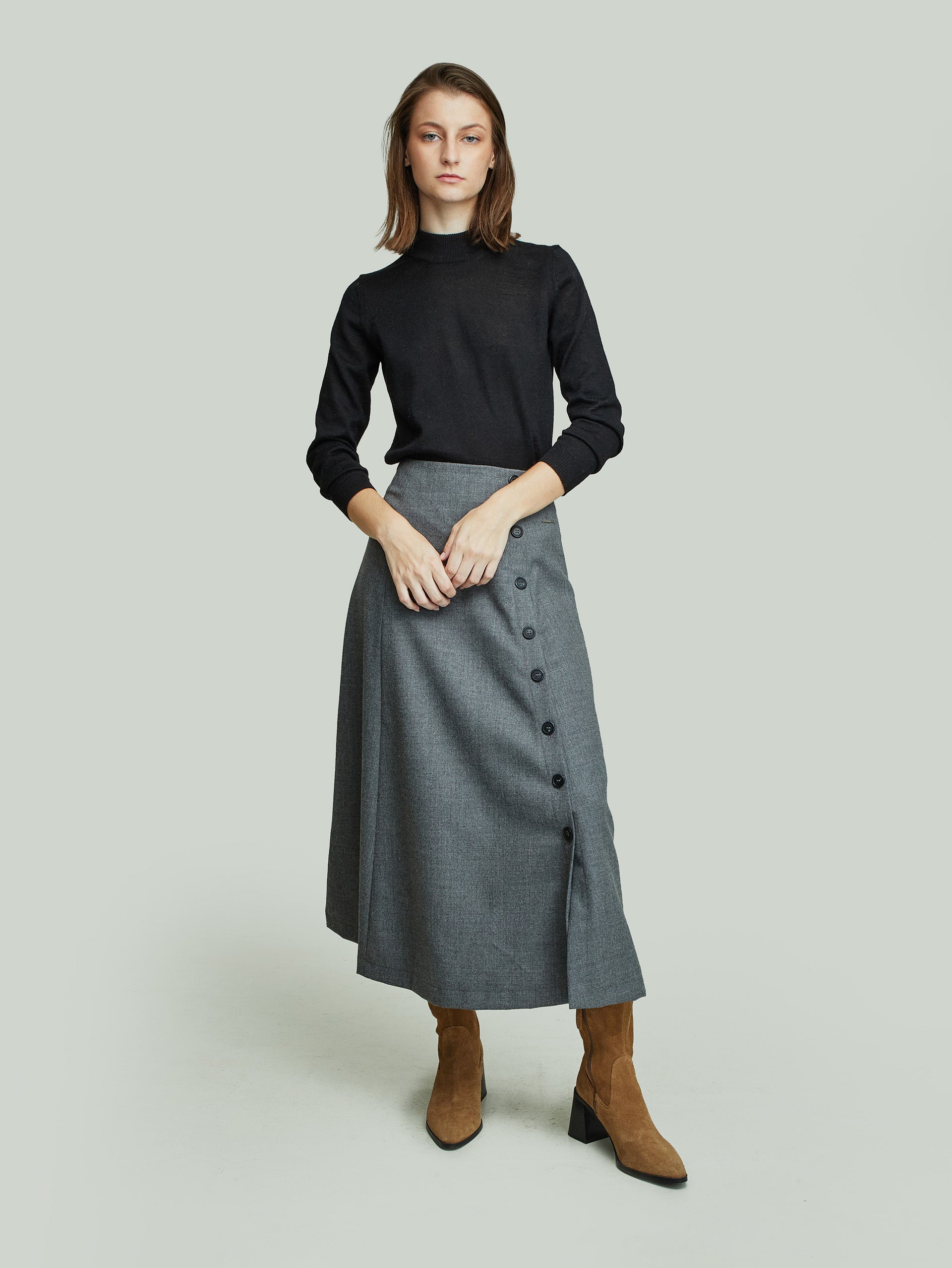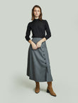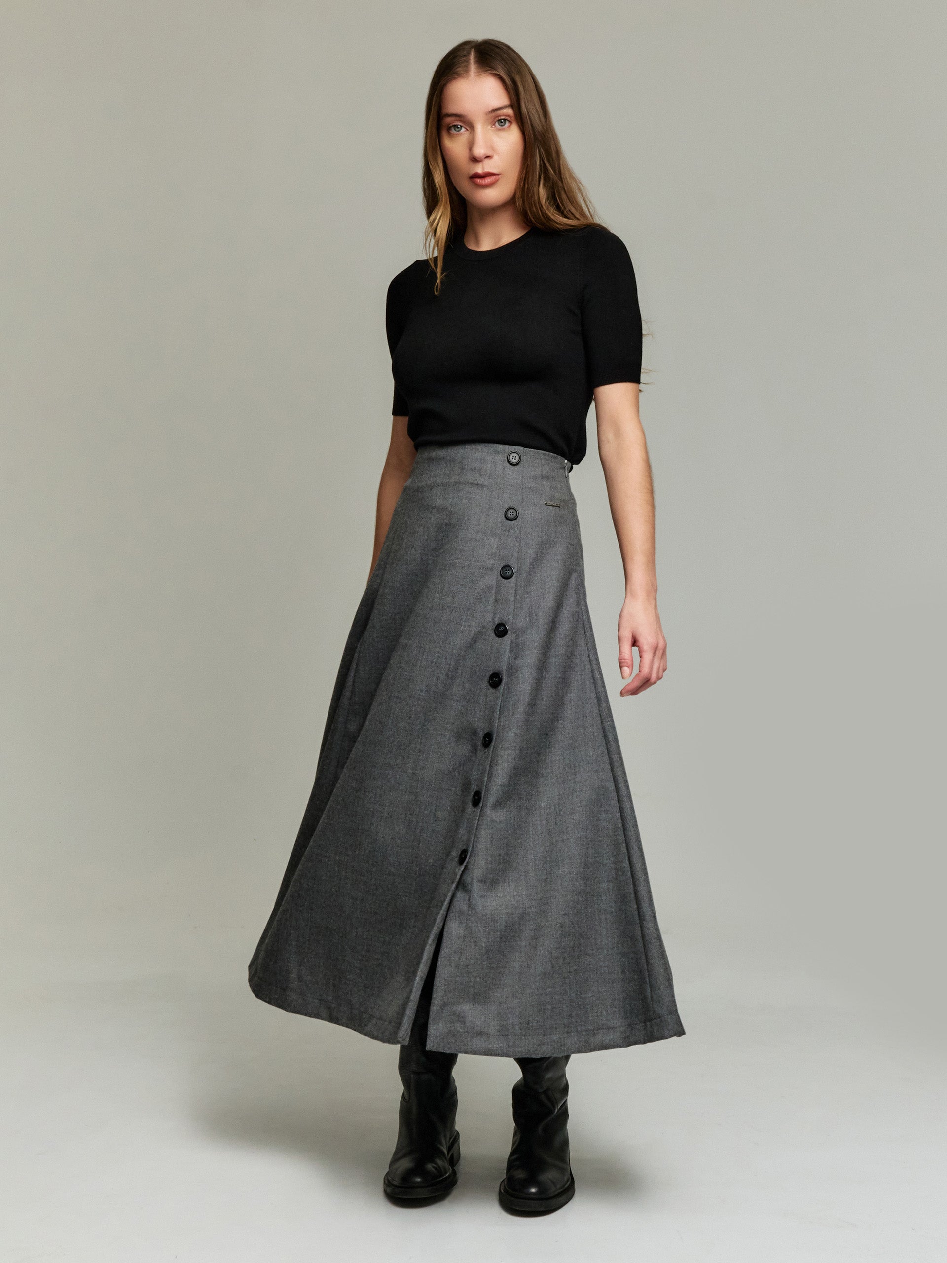 Immerse yourself in the discrete elegance of Ysidro, the must-have skirt for the season. Its carefully crafted design includes buttons on the left side, adding a distinctive touch. Fitted at the waist, the skirt opens subtly creating a charming bell effect, gracefully enhancing the silhouette. Made of wool and baby alpaca. | Material predominante: Wool