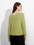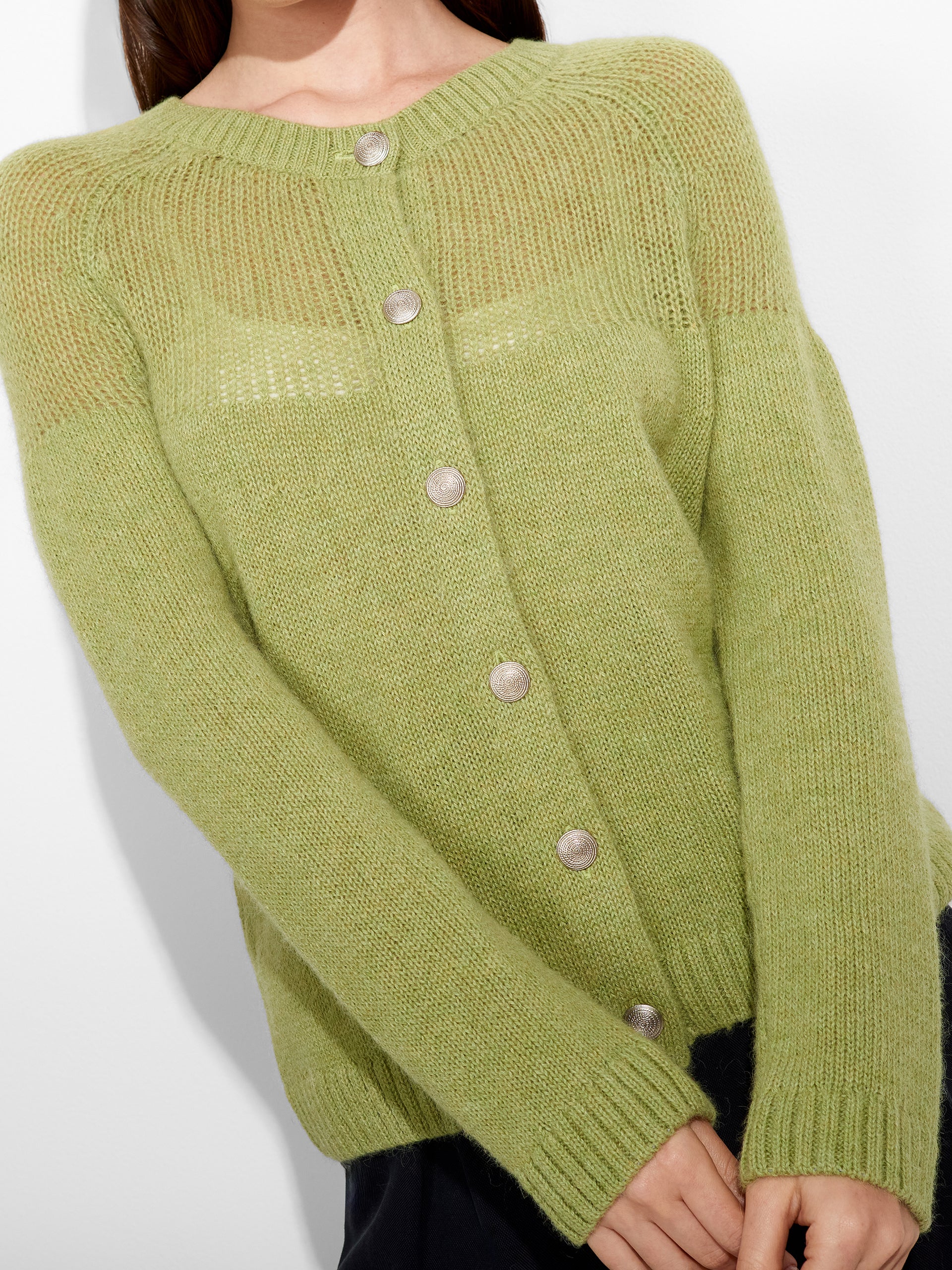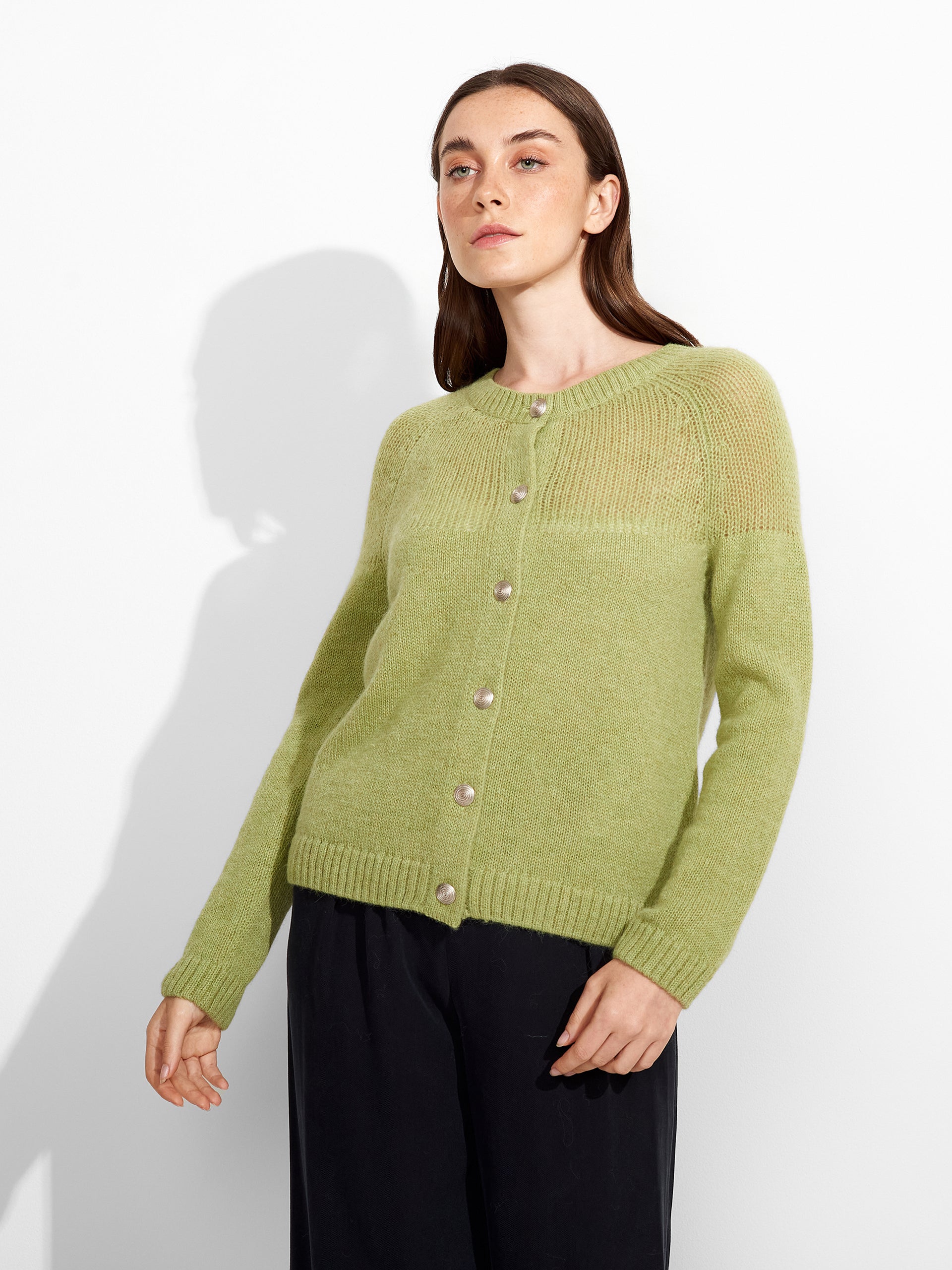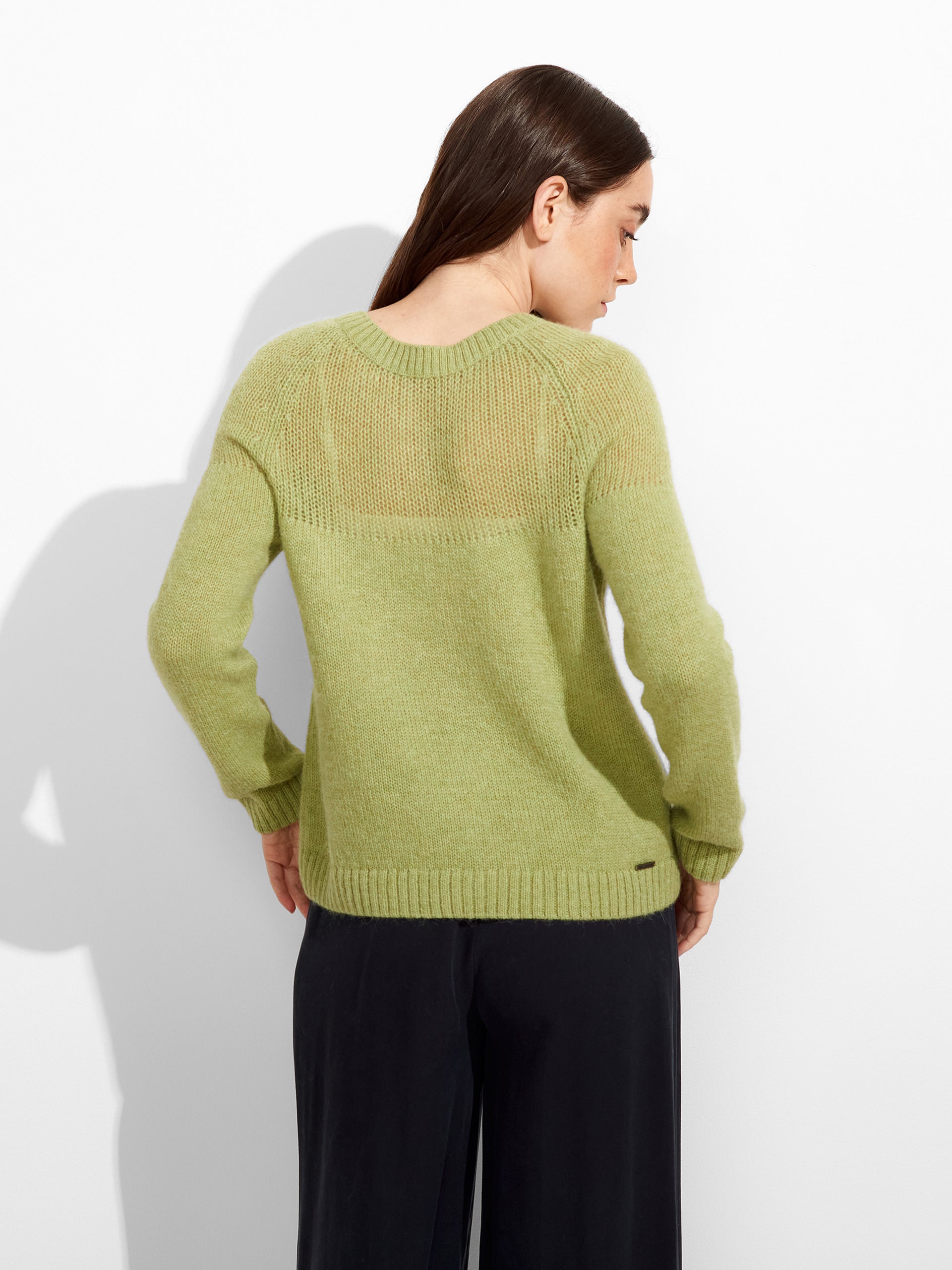 Zabine Sweater in green tone, convertible into a sweater or cardigan, with a closed round neck. Featuring buttons that allow its transformation. Crafted from baby alpaca, it offers warmth and exceptional softness. | Predominant material: Baby Alpaca