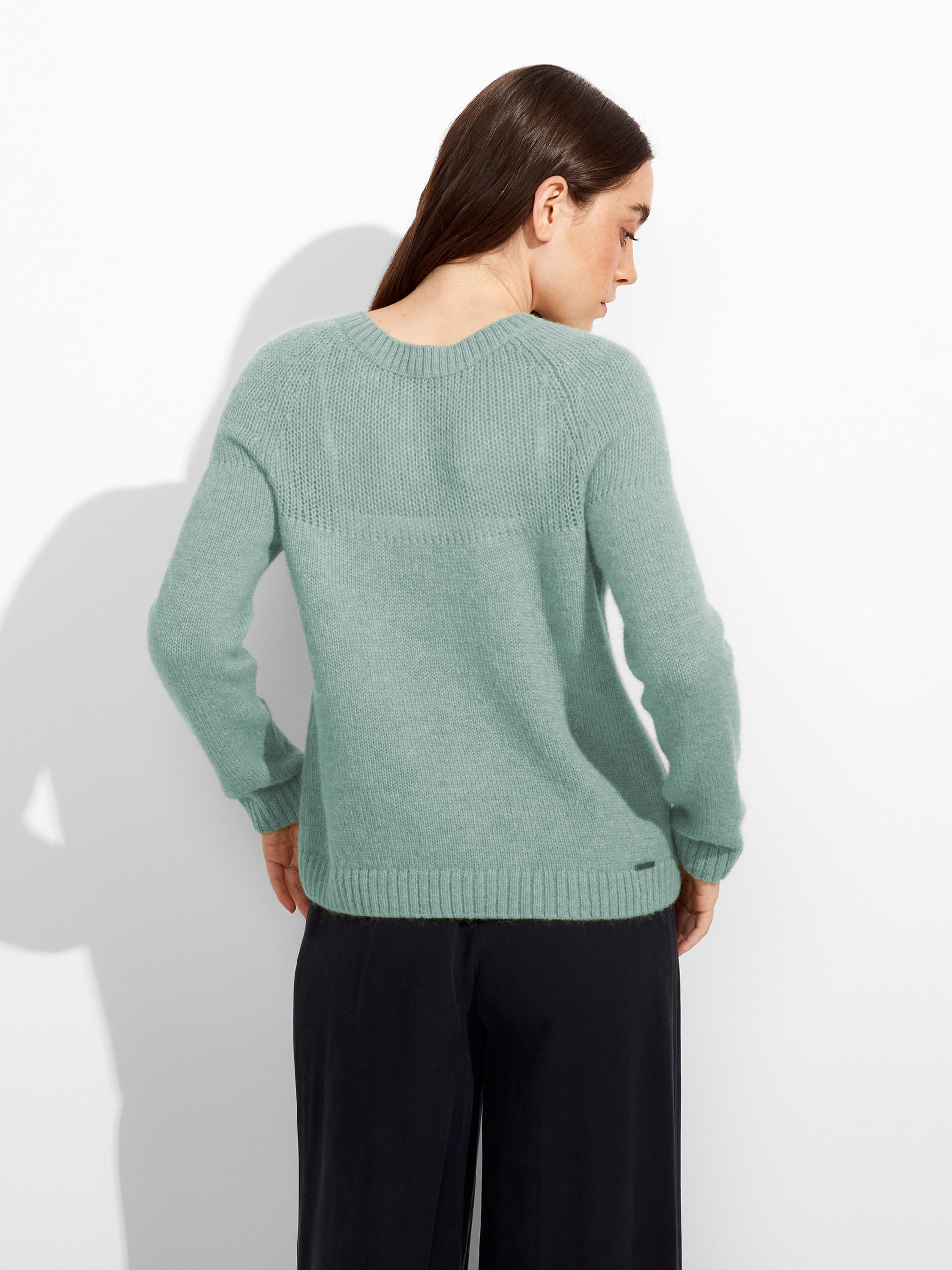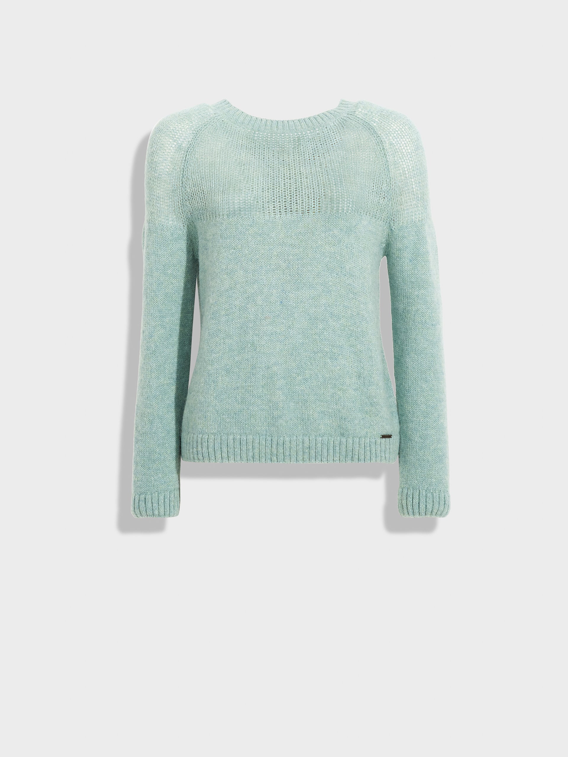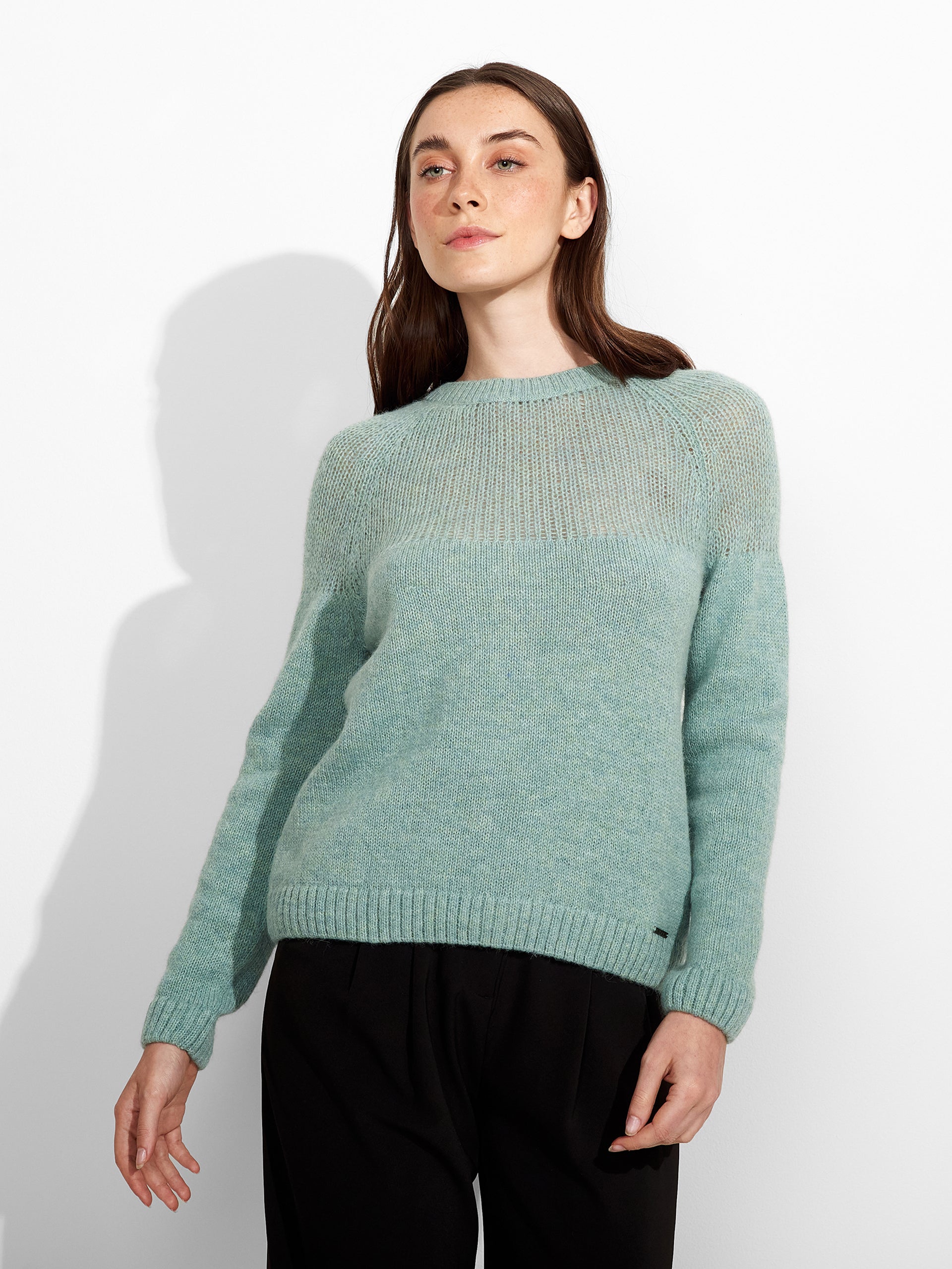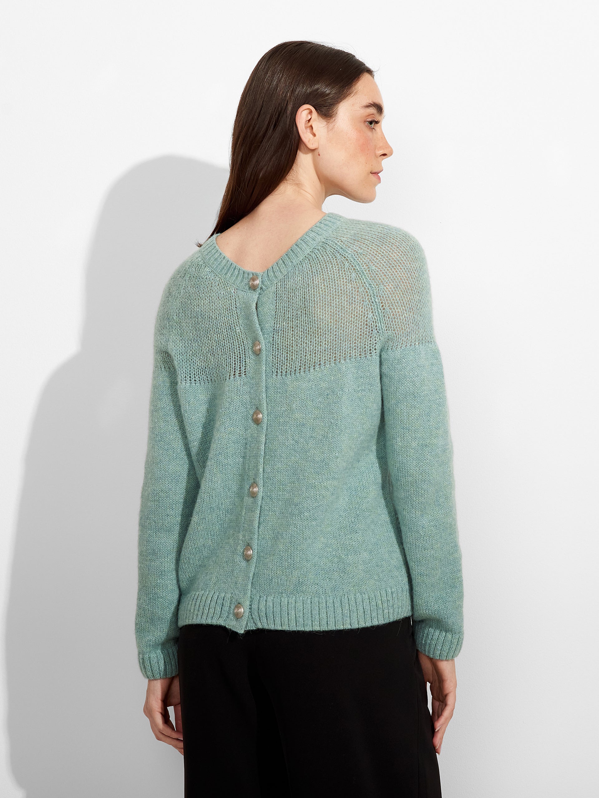 Zabine Sweater in light blue tone, convertible into a sweater or cardigan, with a closed round neck. Featuring buttons that allow its transformation. Crafted from baby alpaca, it offers warmth and exceptional softness. | Predominant material: Baby Alpaca