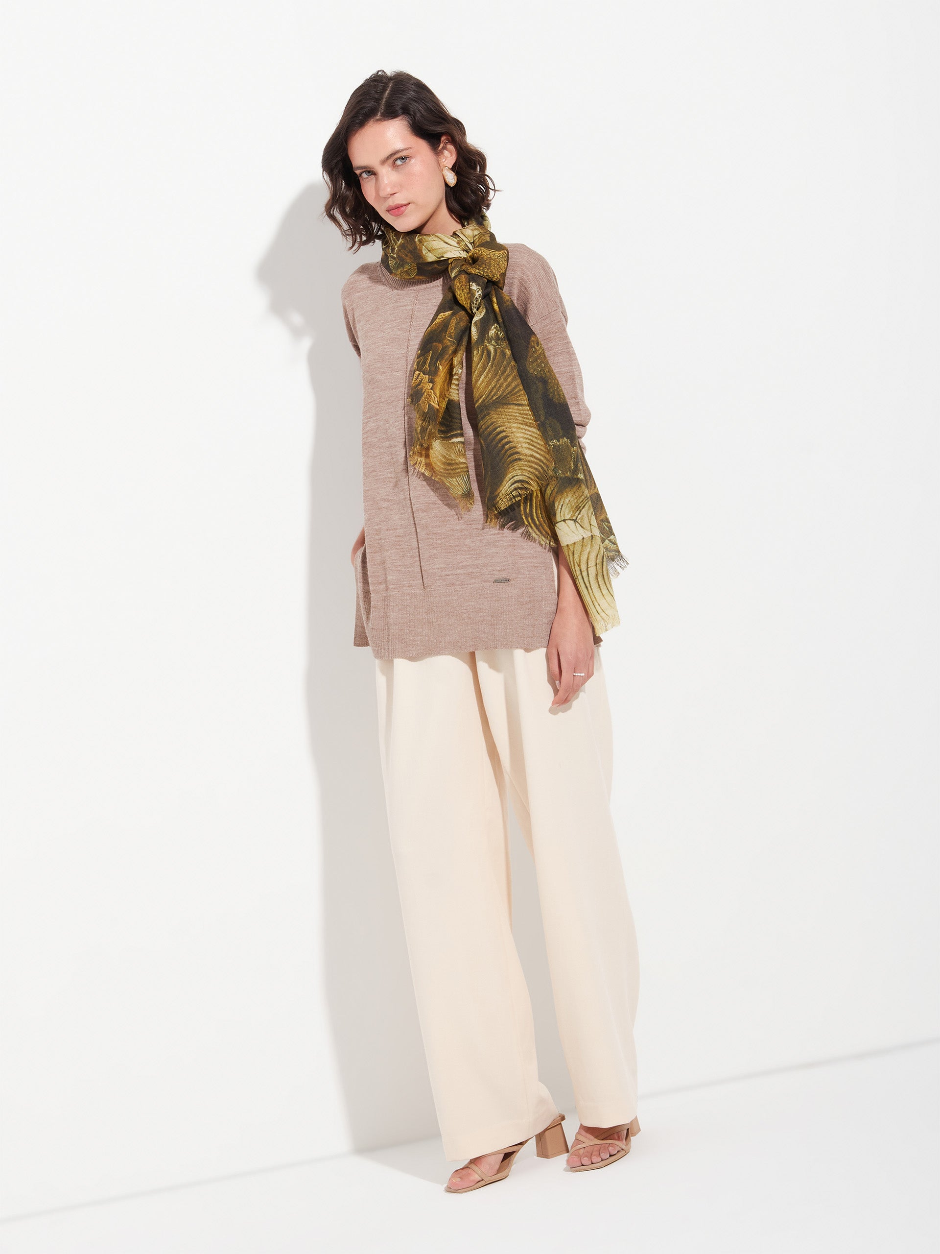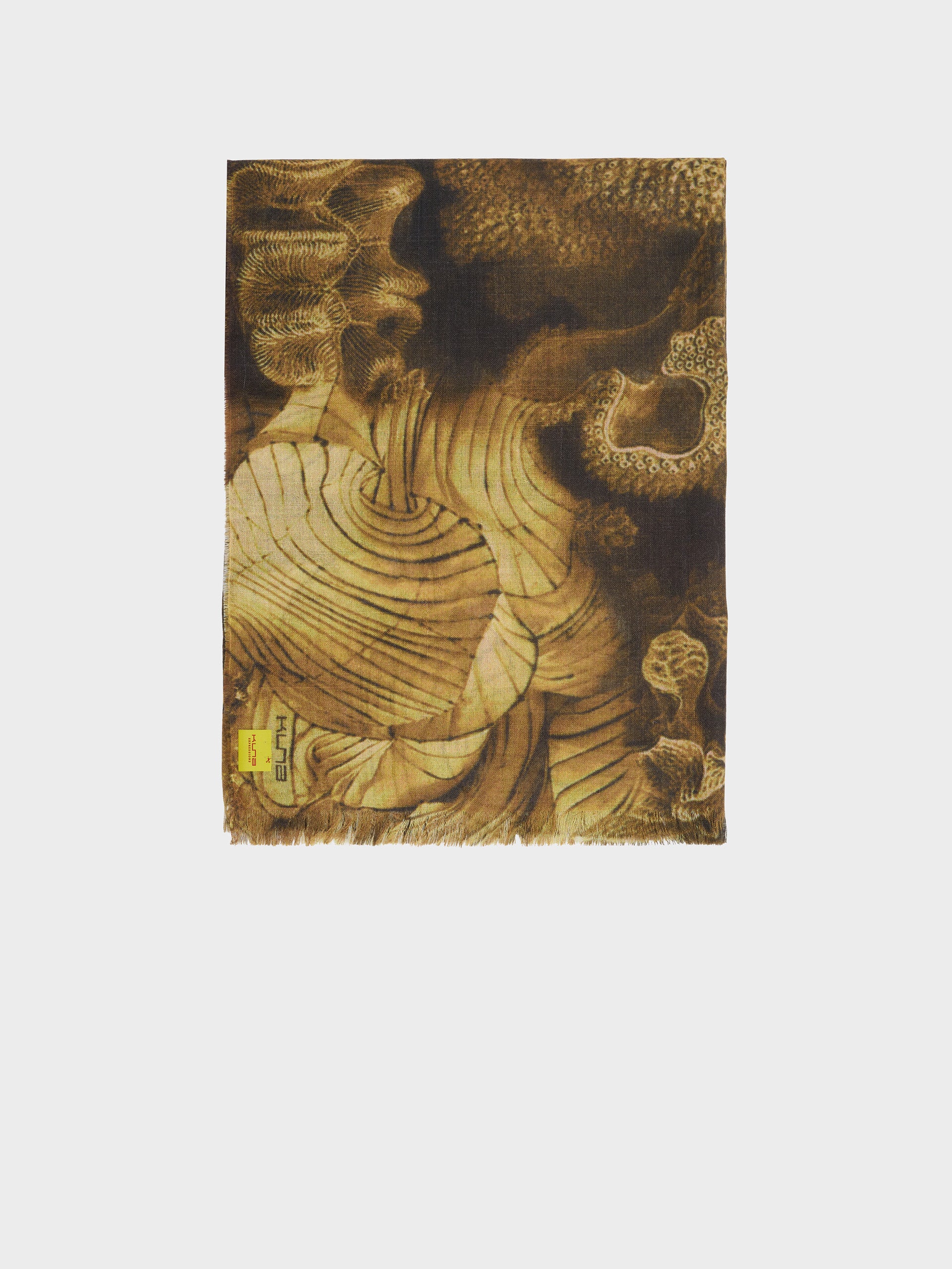 Zanone stole in yellow, made from baby alpaca and silk. It features a delicate digital print and ruffles that add movement and fluidity. Ideal for adding an artistic and sophisticated touch. | Predominant material: Baby Alpaca