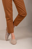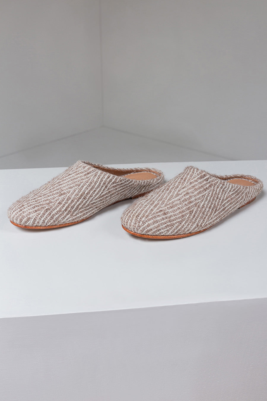 The iconic slipper style revamped through our eco-friendly alpaca and wool fabric, made with natural fibre tones. The interior, entirely lined with leather, lends elegance while providing extraordinary comfort.