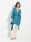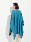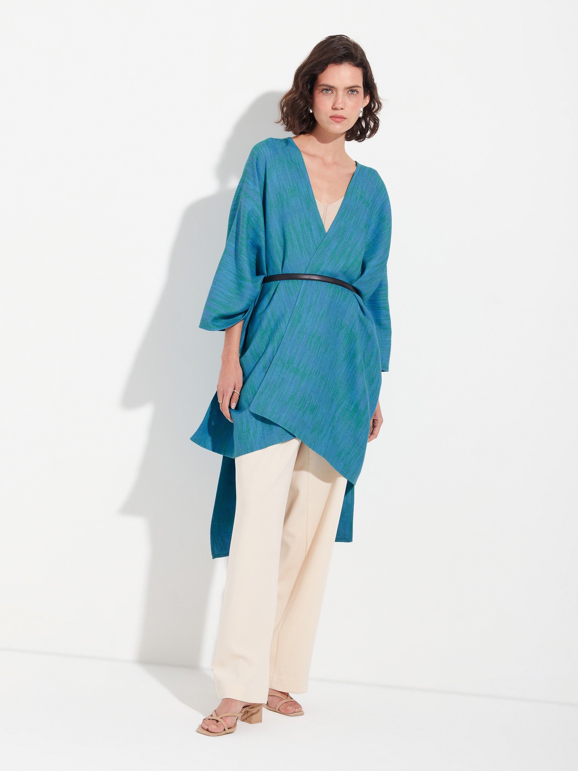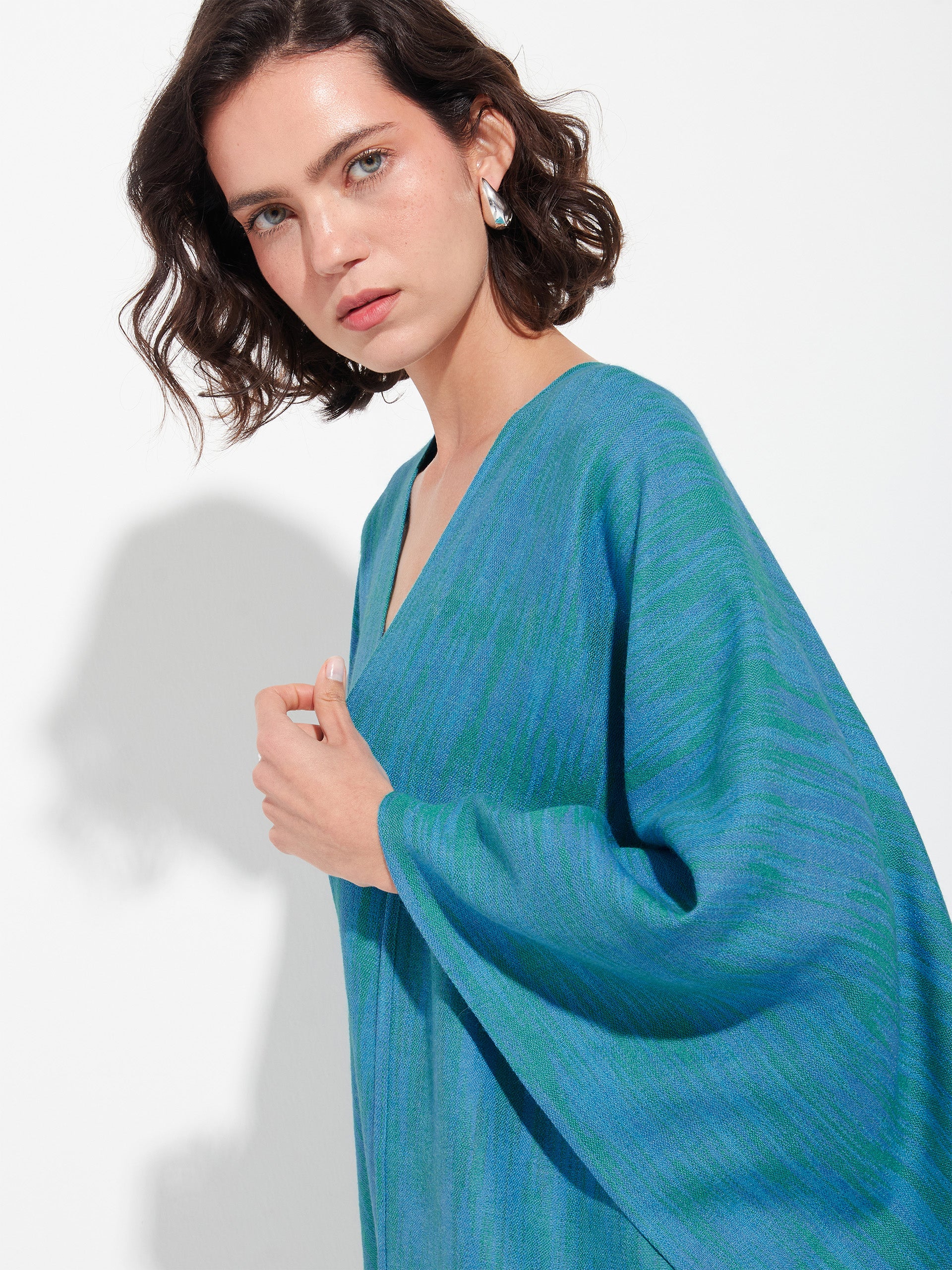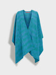 Zareli cape in green, made from baby alpaca and silk. It is a double-sided cape with a three-color jacquard design, combining warmth, texture, and timeless elegance. | Predominant material: Baby Alpaca