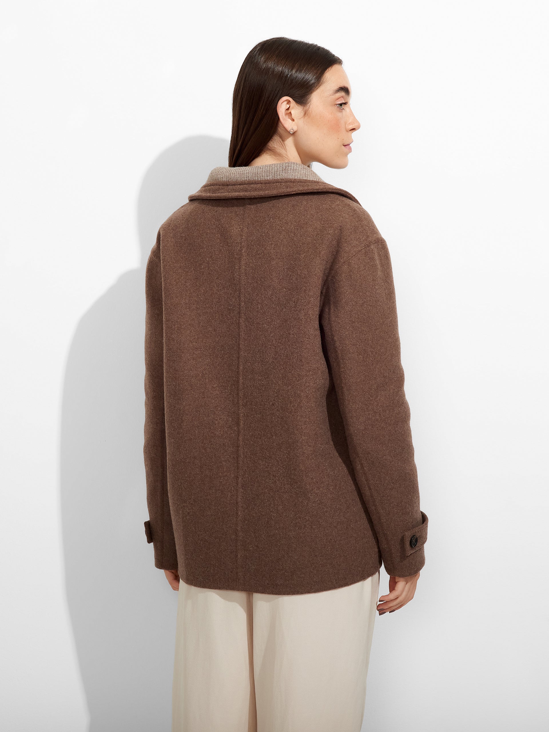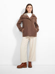 Zazie Coat in beige tone, with an oversized silhouette and unlined construction. Features horn buttons and metal snaps, with a contrasting knit fabric detail on the inside of the collar. Crafted from baby soft alpaca, wool, and nylon. | Predominant material: Baby Alpaca