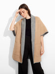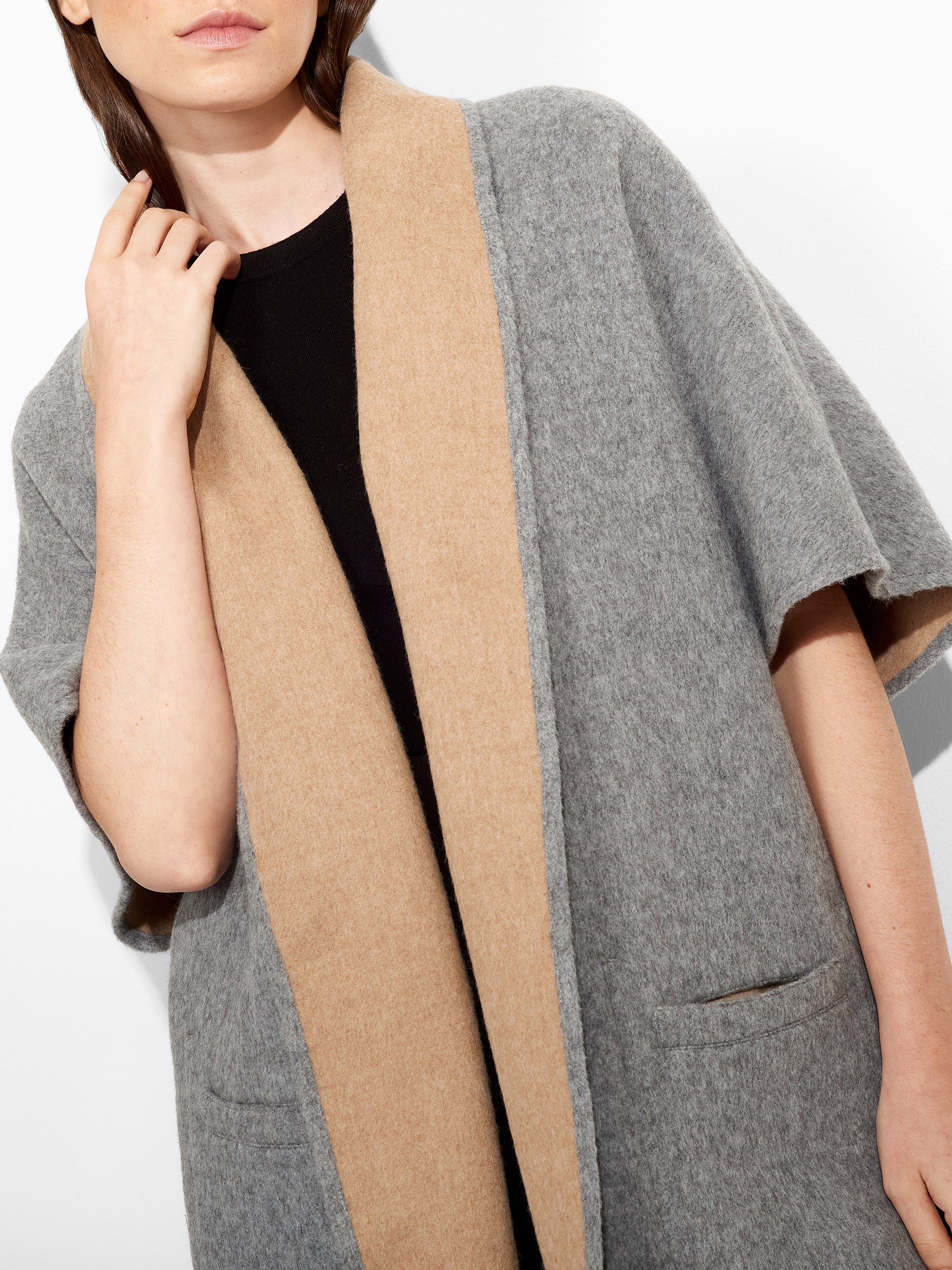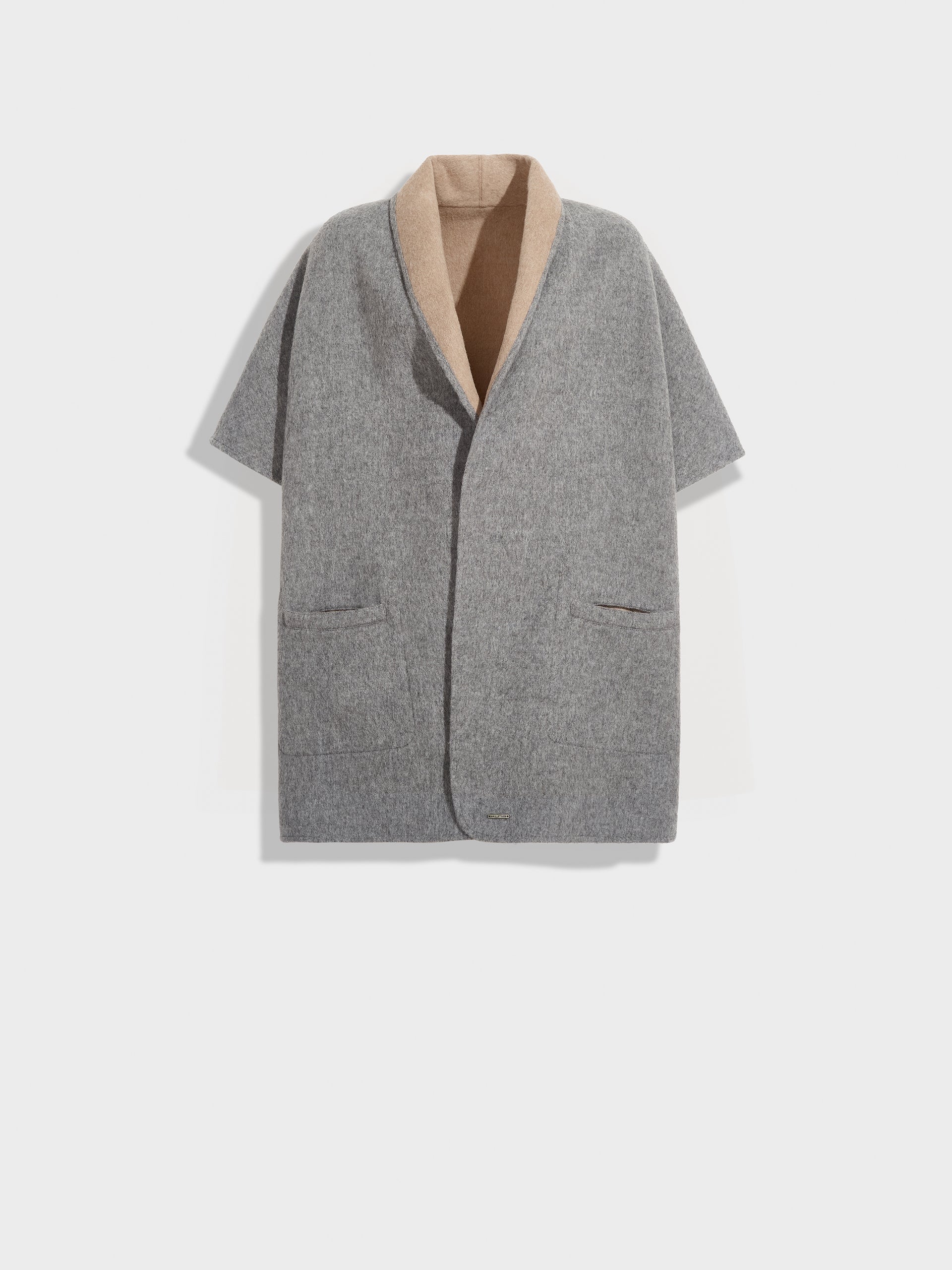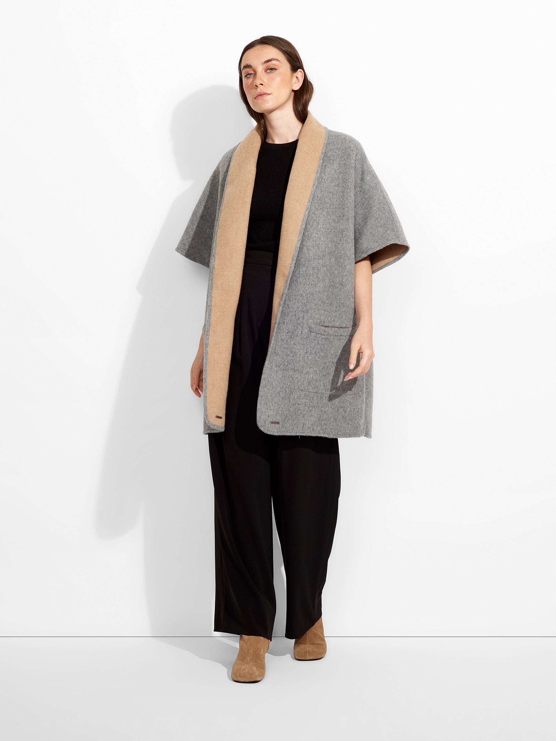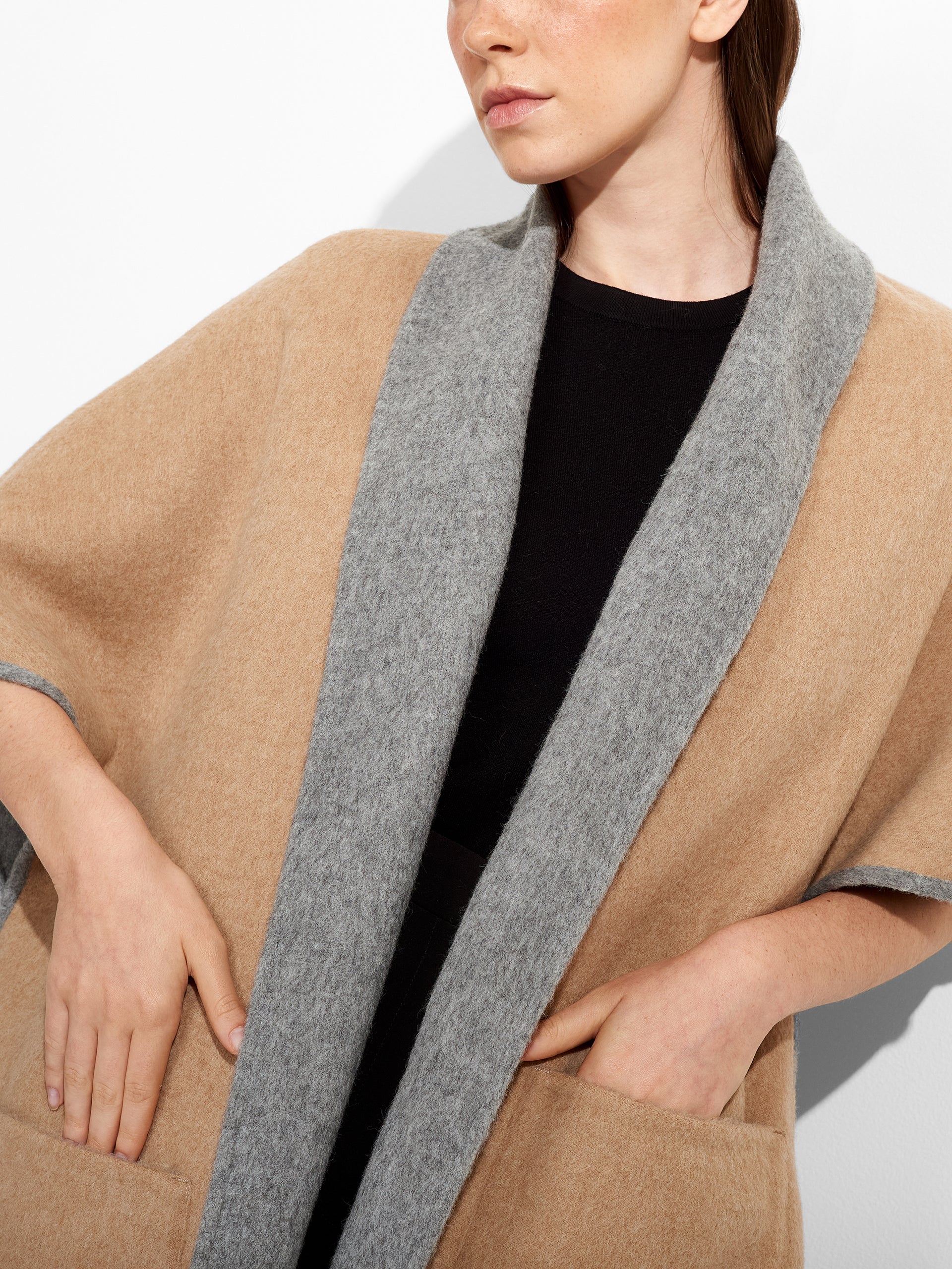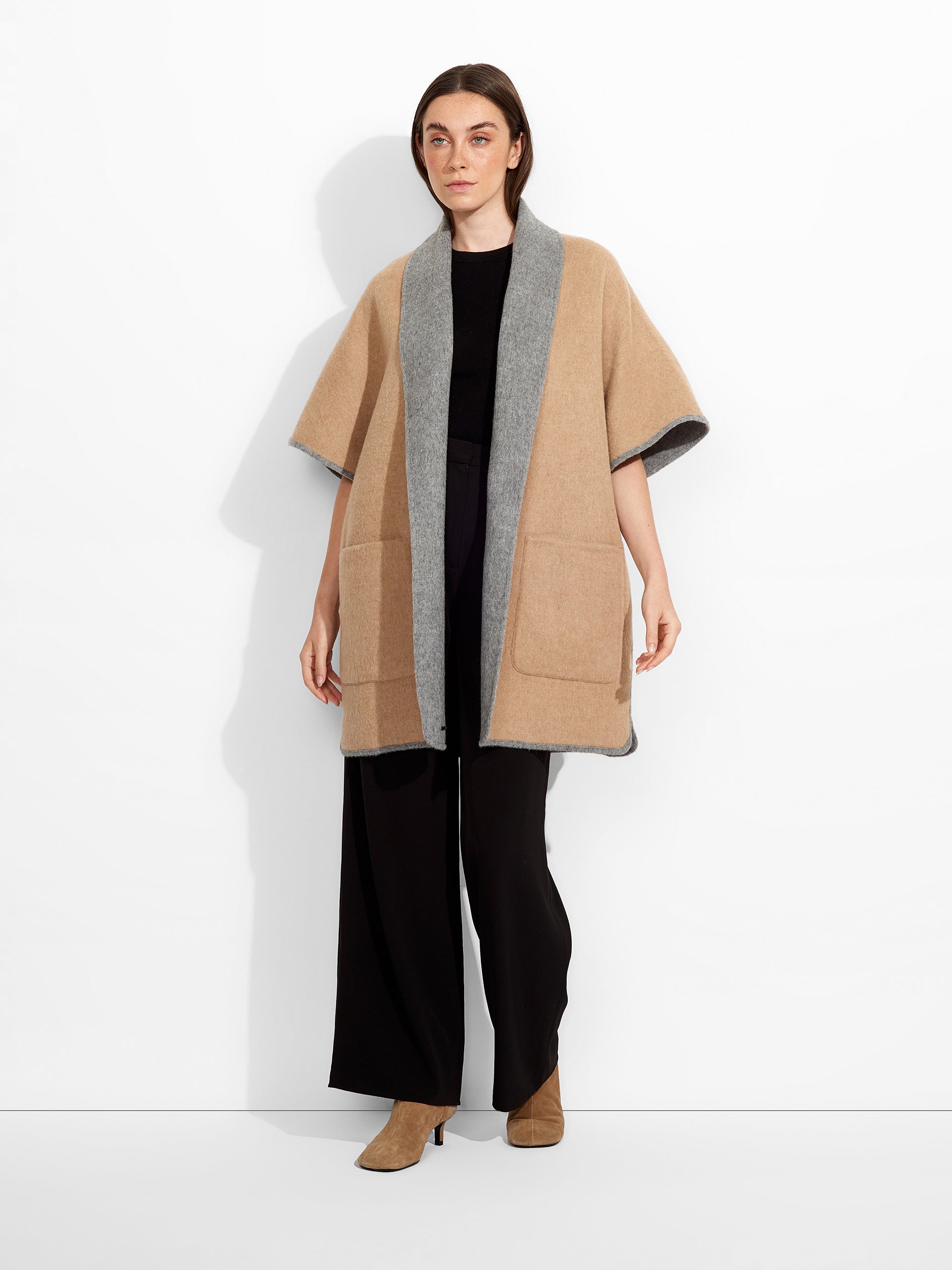 Zea Cape in beige, stands out for its reversible design, offering versatility in styling. It features patch pockets and an elegant shawl collar. Crafted from a soft blend of baby alpaca and wool. | Predominant material: Baby Alpaca