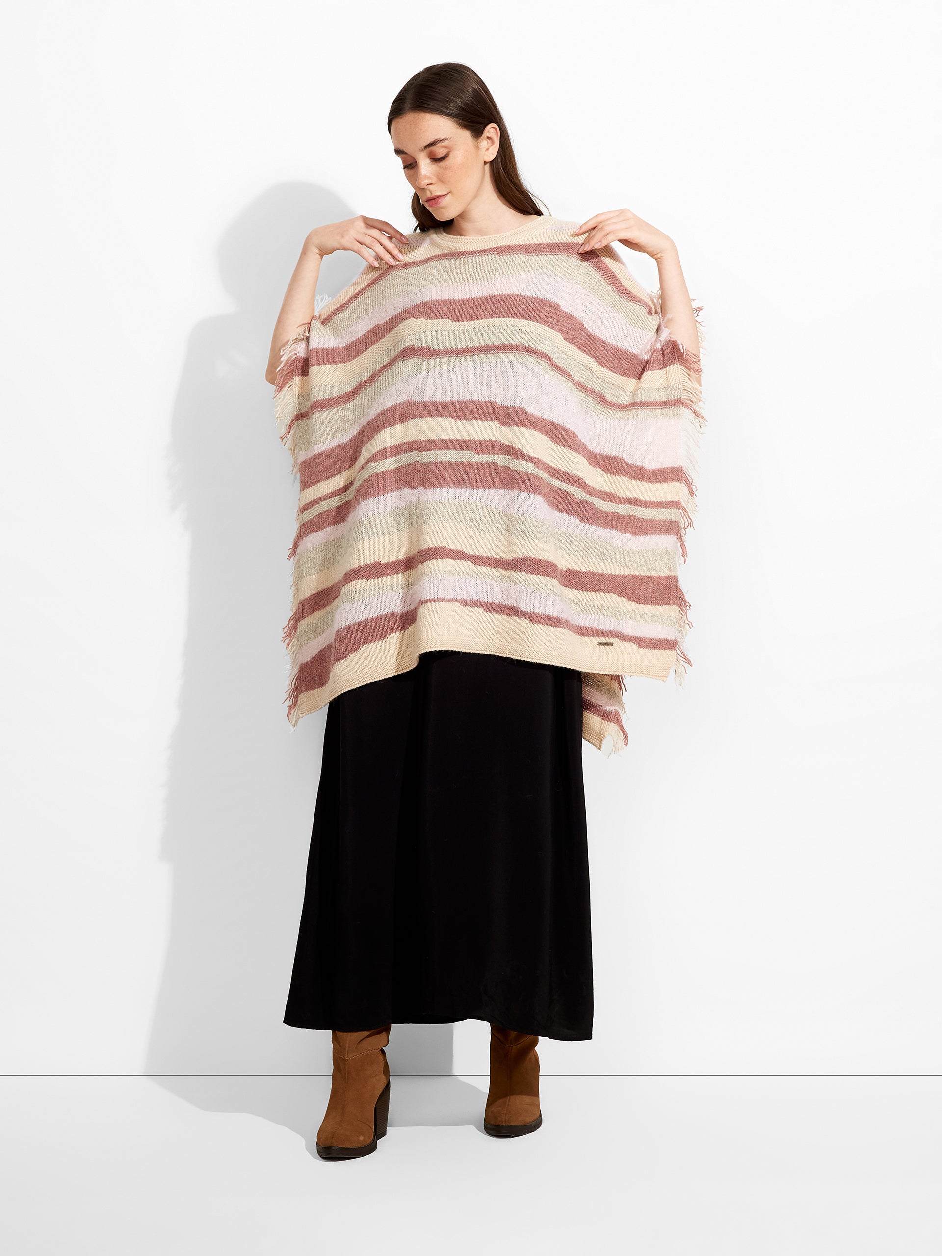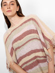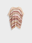 Zegovia Poncho in beige tone, featuring horizontal stripes and a loose-knit design that offers a light and elegant drape. The fringed edges add a distinctive detail. Crafted from a blend of baby alpaca, suri alpaca, and silk for a soft and comfortable texture. | Predominant material: Baby Alpaca