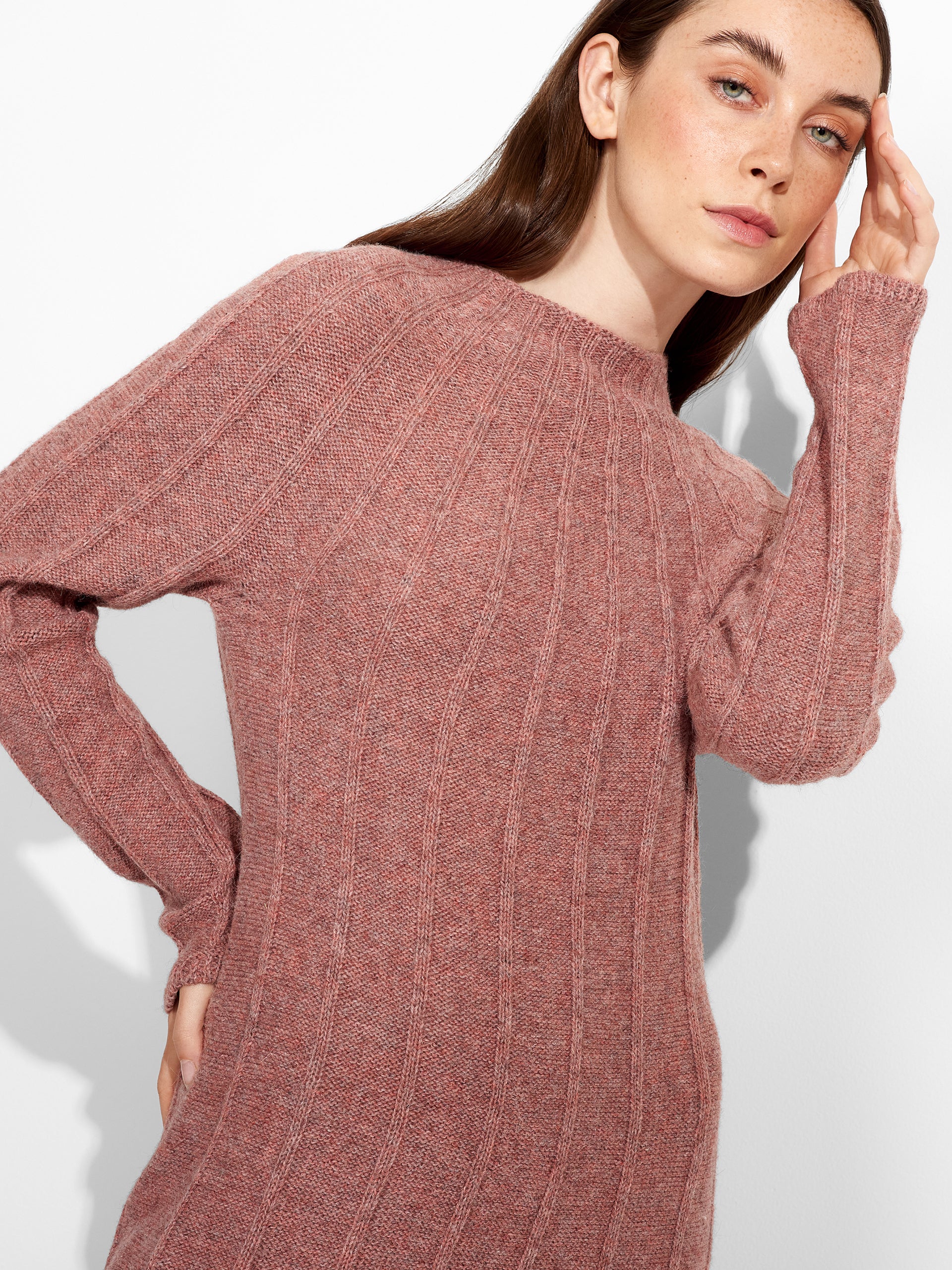 Zephir Dress in pink tone, featuring a semi-fitted cut at the top and a slightly flared A-line skirt. It showcases vertical sections with pronounced ribbed knit, adding texture, and features a round neckline. Crafted from baby alpaca. | Predominant material: Baby Alpaca