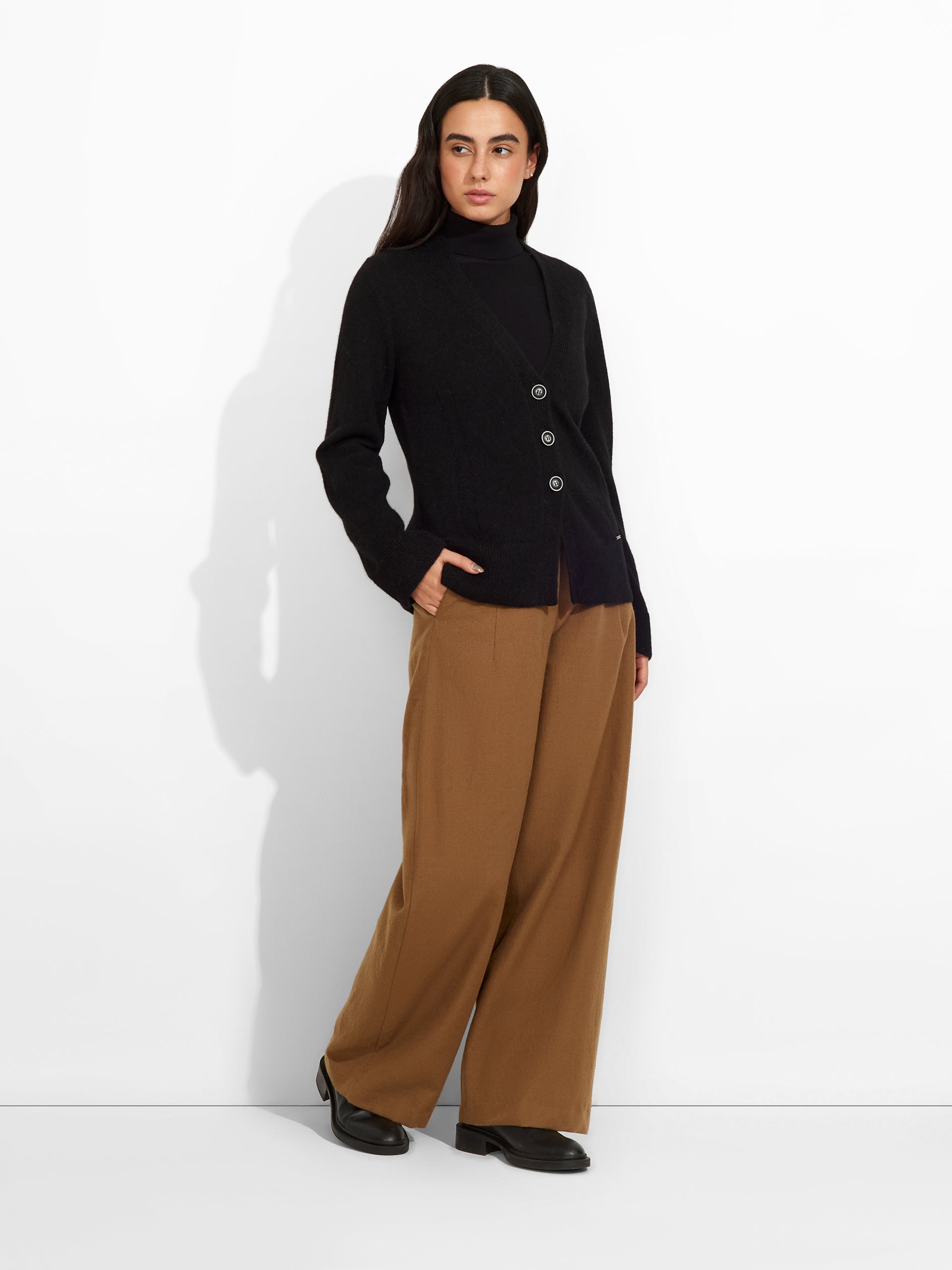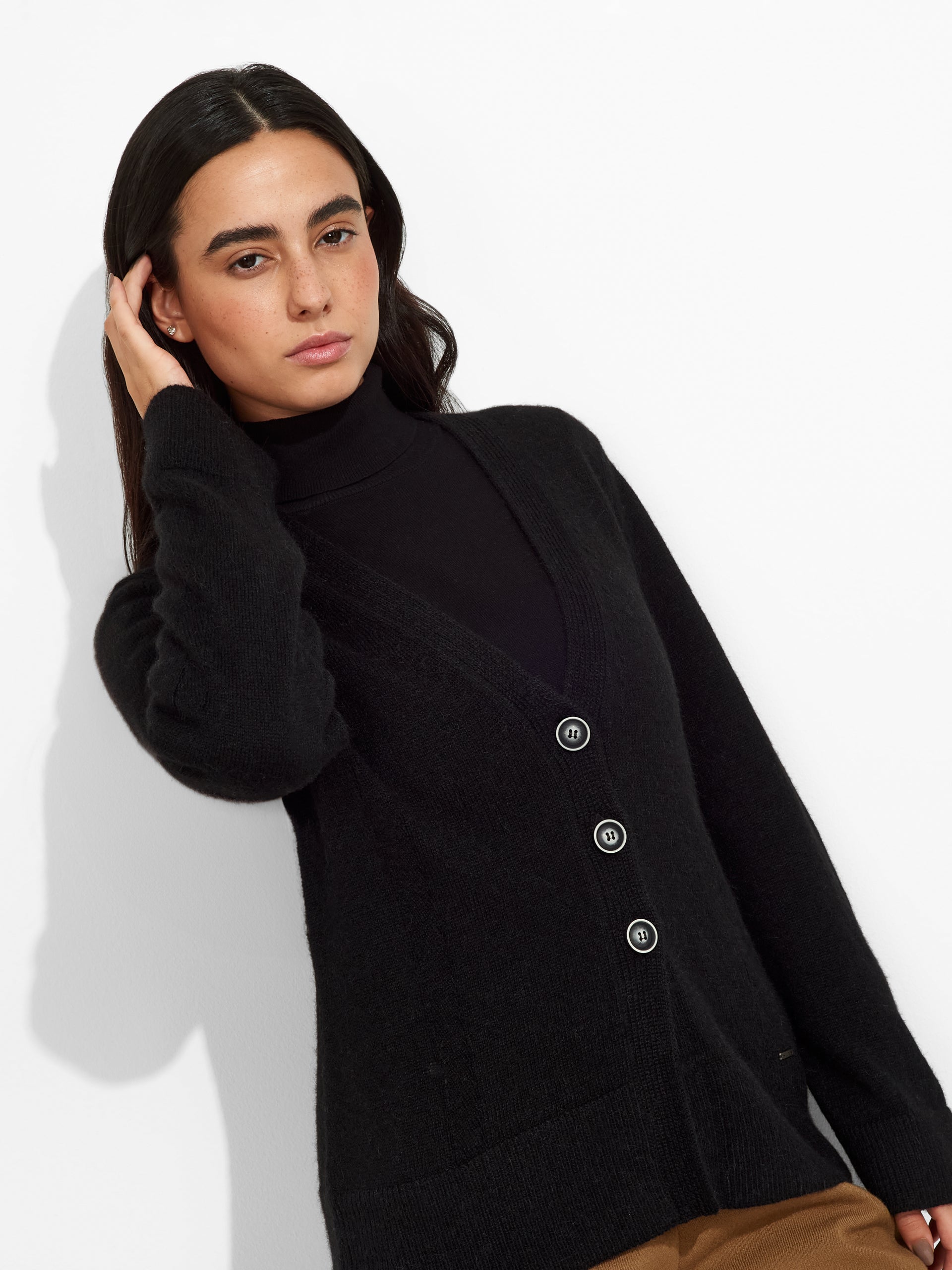 Zia Cardigan in black tone, with a classic cut, button closure, and a V-neckline. Crafted from baby alpaca, it offers warmth and exceptional softness. | Predominant material: Baby Alpaca