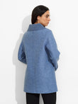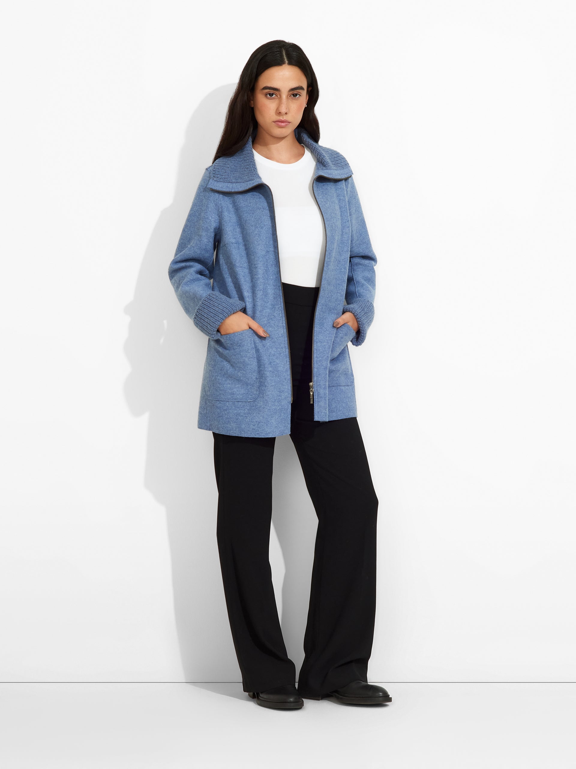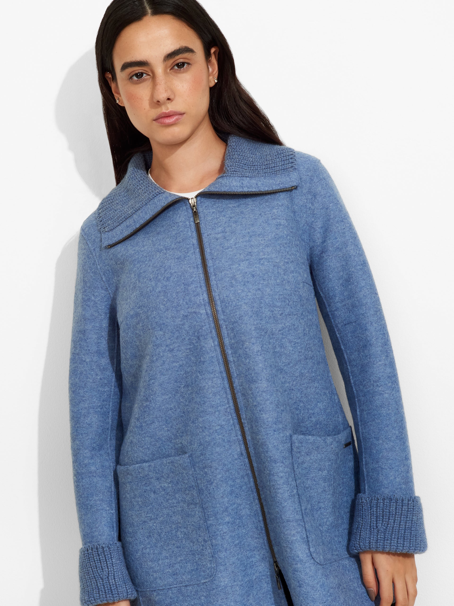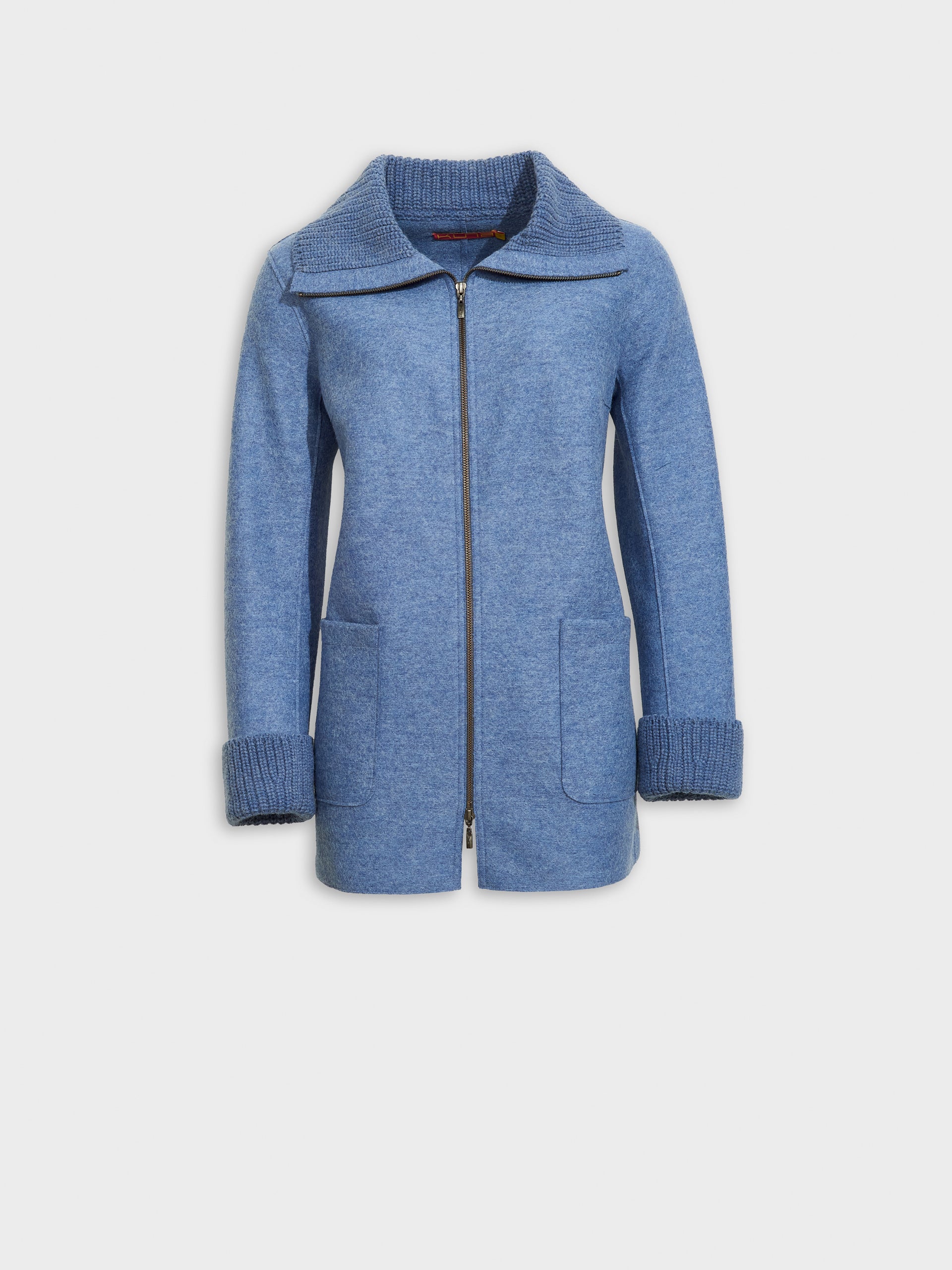 Zingaro Coat in light blue tone, crafted from felted fabric without lining. It features a metal zipper, patch pockets, and knitted details in English rib stitch on the collar and cuffs. Made from alpaca and wool. | Predominant material: Alpaca