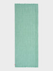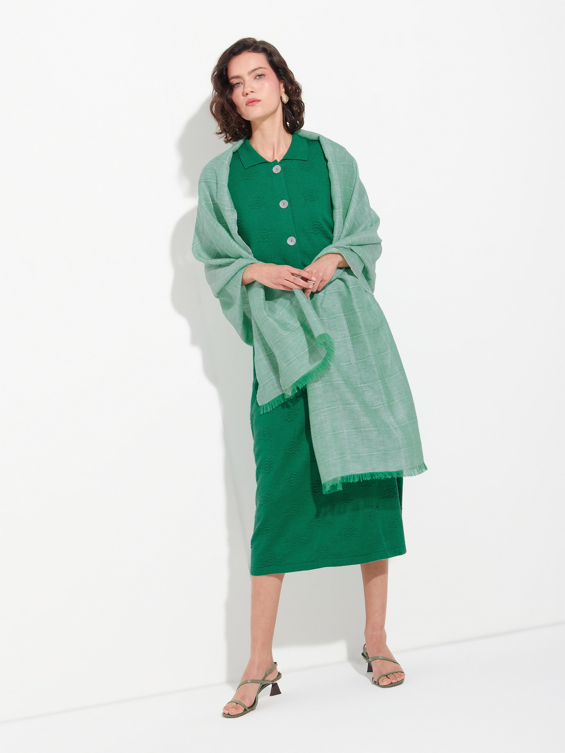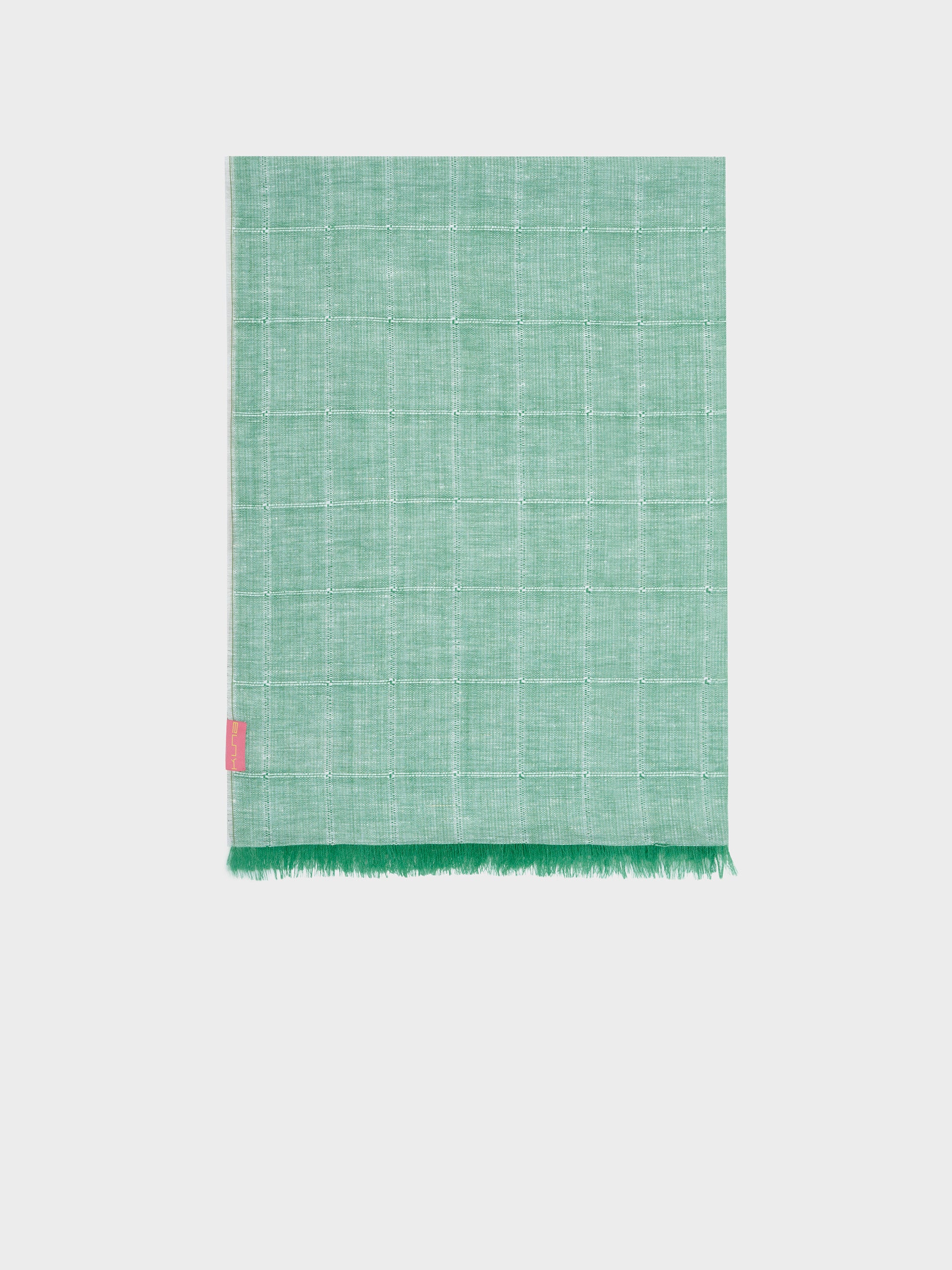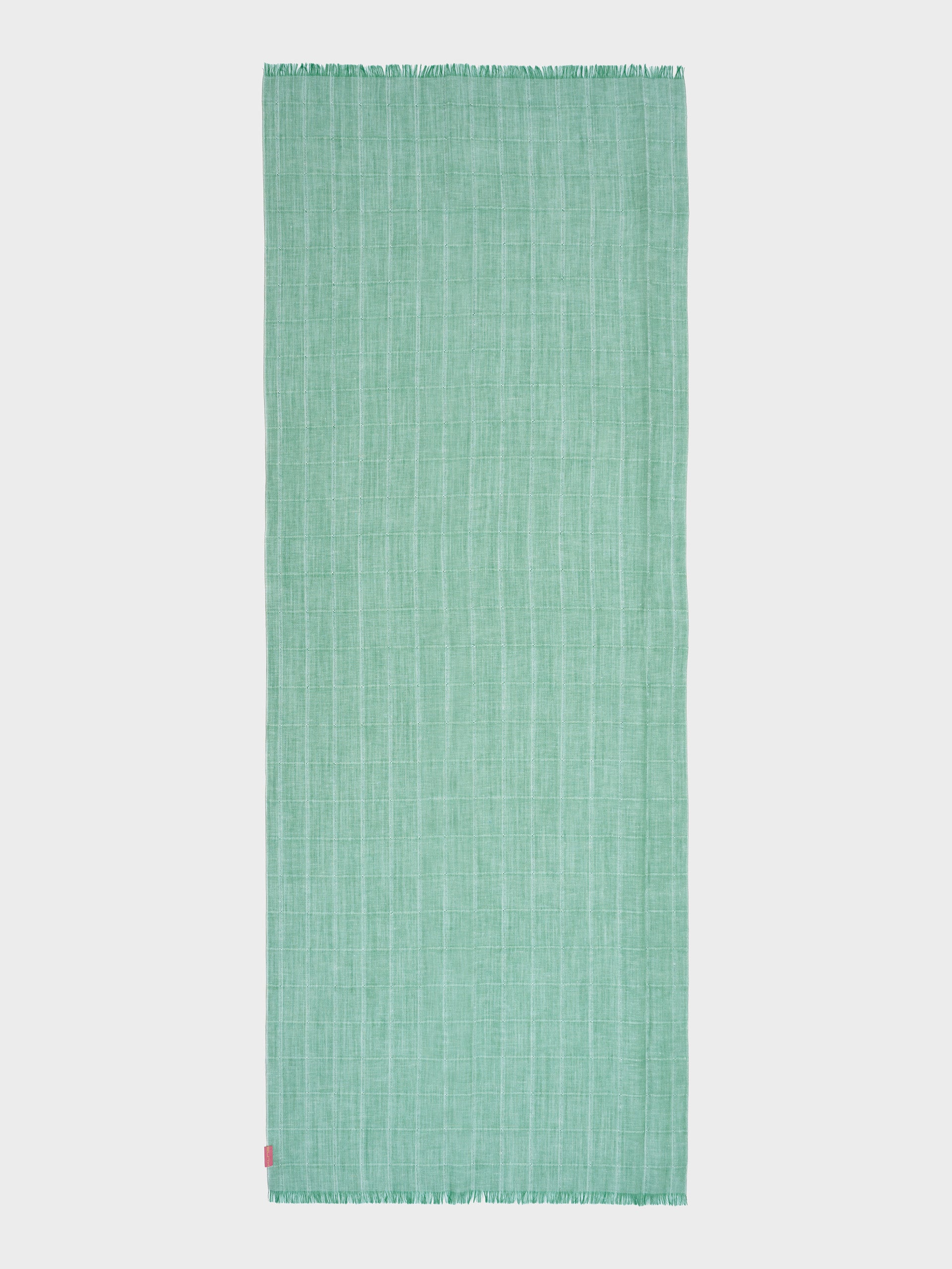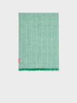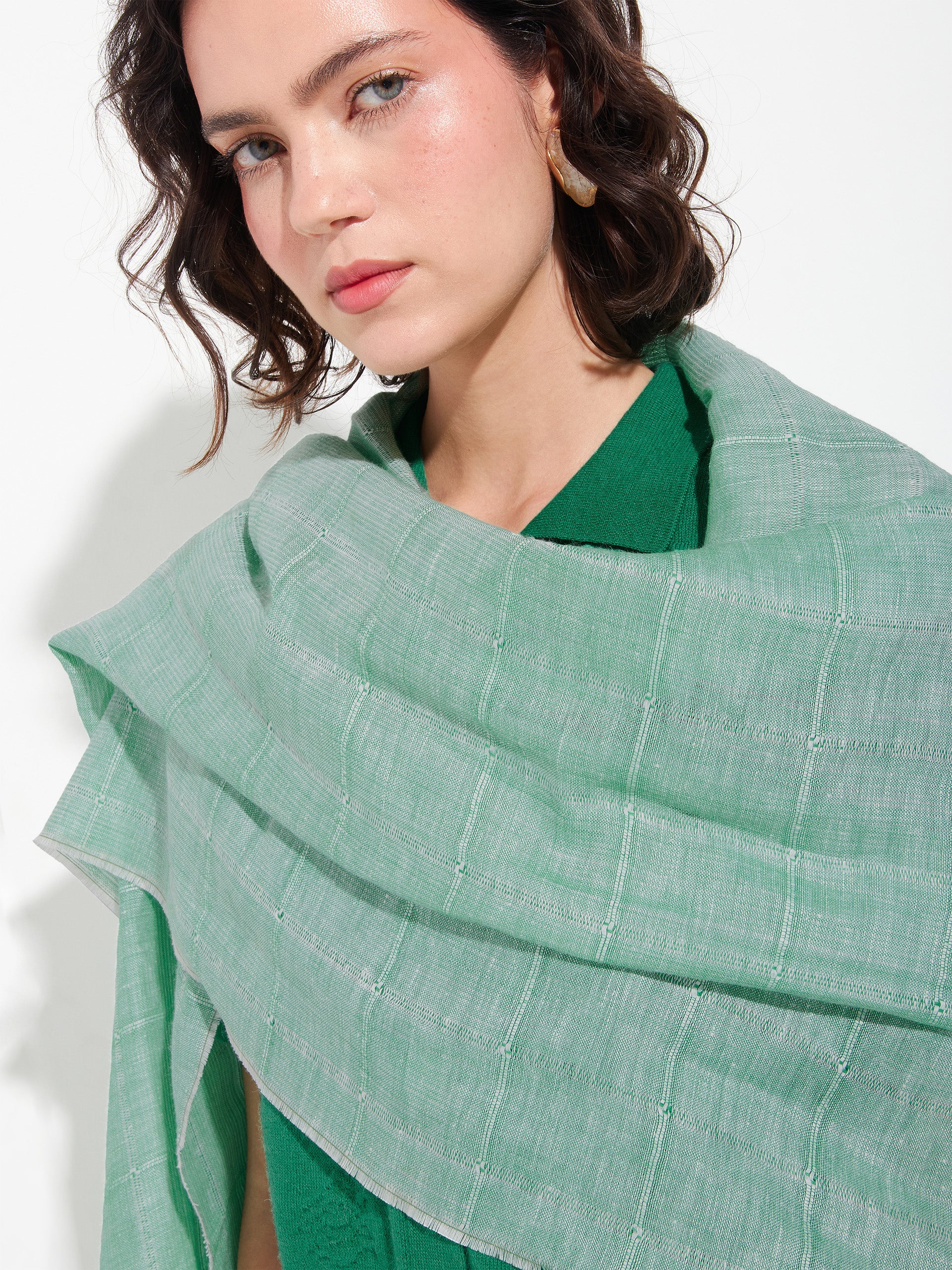 Zoda stole in green, made from a blend of baby alpaca, silk, and linen. It features a panama and taffeta checkered design with a frayed finish, combining lightness, freshness, and artisanal style. | Predominant material: Baby Alpaca