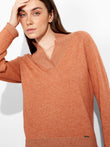 Zolena Sweater in orange tone, featuring a ribbed "V" neckline. Crafted from a blend of cotton and baby alpaca, offering softness and comfort. | Predominant material: Cotton